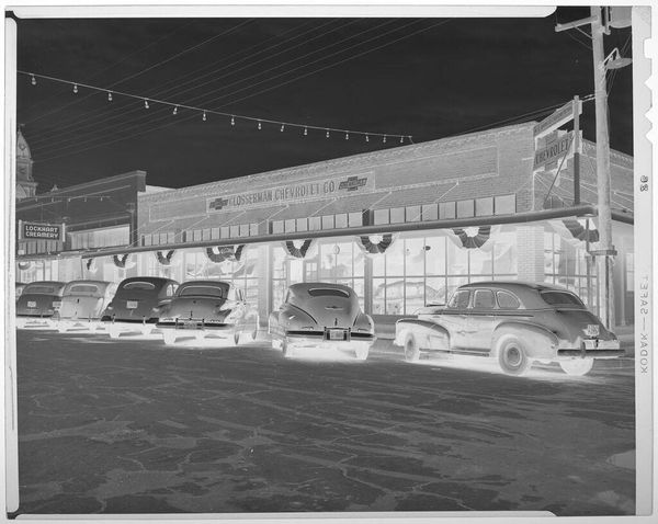 Editor: This photograph, "Untitled (cars advertising used car carnival)" by Hamblin Studio, captures a car dealership, R.G. Edgerton & Company. The vintage cars parked outside look like they are part of some carnival. What can you tell me about the social context of this image? Curator: Well, consider the date. Though unknown, the cars, clothing, and signage certainly give us a sense of an era. It suggests a society embracing the burgeoning automotive industry and its influence on daily life and consumer culture. What statements do you think the dealership is making to the public? Editor: That it is a space for possibility and celebration, maybe? Curator: Precisely. The photograph, then, isn’t just about selling cars; it is about selling a lifestyle and contributing to the evolving visual landscape of commerce. I now see the building and cars as artifacts. What do you think? Editor: I agree. Thinking about it that way really changes how I see the image. Thanks!