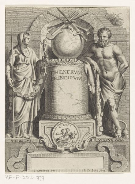 Editor: This is "Allegory of the New Testament with Christ and John the Baptist" by Abraham de Blois, from between 1651 and 1679. It's an engraving. I'm immediately drawn to the crispness of the lines and the way the composition seems to frame the text. What strikes you first when looking at it? Curator: The interplay between text and image. Note how the text block, proclaiming "The Holy Stories of the New Testament," acts as the central plinth, supporting allegorical figures and symbols. Consider the formal structure: Christ and John the Baptist flank this plinth, while cherubs and the Lamb of God crown it. Editor: That's a good point about the central plinth and symmetry! The figures of Christ and John feel very different despite mirroring each other. What creates that difference? Curator: Precisely. Examine their postures, their gazes, their relationship to the plinth. Christ raises his hand in blessing or teaching. John the Baptist gestures toward the inscription. Their poses guide the eye and contribute to the work’s internal dynamics. Further consider the medium of engraving. What effect does its reliance on line have on the overall image? Editor: The linework makes the whole image very defined, adding a sense of clarity. It almost looks graphic, which suits its purpose of illustrating the New Testament. I wouldn’t have picked up on the significance of their gestures and placement without your guidance. Curator: Notice how that very linearity influences the rendering of depth and volume. The forms are constructed through carefully modulated lines, creating a tactile quality, wouldn't you say? Through precise execution, a captivating symbolic narrative is produced for the audience. Editor: Absolutely. I appreciate how analyzing its structure really unpacks the intended reading.