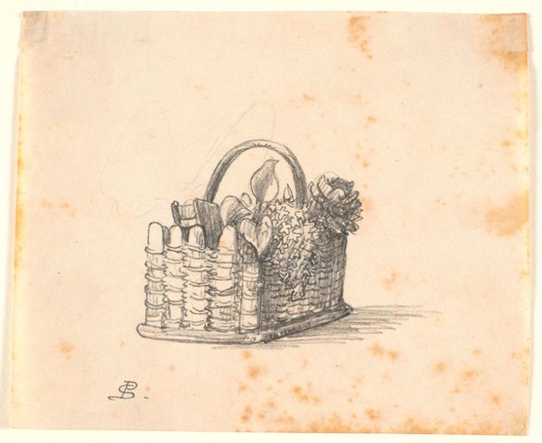 Editor: Here we have "Mand met boek en breiwerk," which translates to "Basket with book and knitting," a pencil drawing made sometime between 1789 and 1859 by Pieter de Goeje. The crosshatching gives a real sense of the basket's texture. How do you interpret this work? Curator: I observe the emphasis placed on form through the meticulously rendered textures and the geometric structure of the woven basket itself. Notice the way De Goeje uses line weight to define the edges and create depth, particularly in the rendering of the wickerwork. It is, in essence, a study of volumes in a restricted palette. Editor: That’s true, it almost feels like an exercise in representing three-dimensionality. Why render such mundane objects with such precision? Curator: Precisely. Mundane objects presented with exceptional technical skill serve as studies of representation. De Goeje's choice to depict a commonplace basket filled with equally ordinary objects invites a focus on the 'how' rather than the 'what' – it becomes an investigation of artistic form itself, divorcing the objects from their potential narrative associations. Do you agree? Editor: I do. It reframes how I look at everyday objects in art, focusing instead on technique and structure. Thanks for that insight! Curator: Indeed. The focus is, ultimately, the visual language itself. A useful thing to keep in mind going forward.