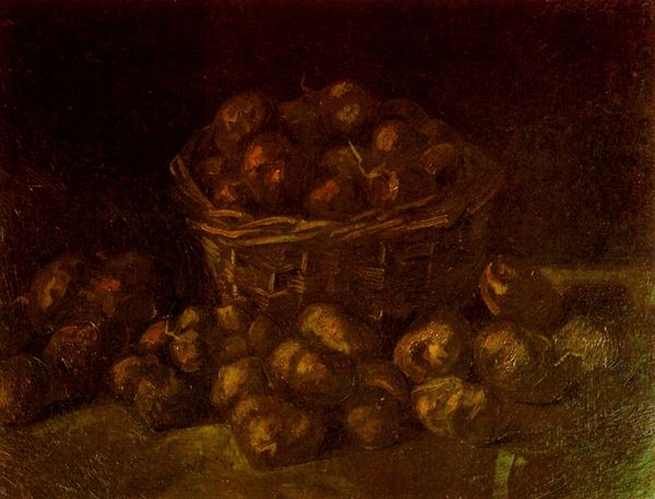 Vincent van Gogh created this painting, "Still Life with a Basket of Apples," using oil on canvas. At first glance, the eye is drawn into a world of earthy tones and textures. The composition, dominated by a tightly packed arrangement of apples, creates a sense of abundance and weight. Van Gogh uses color and brushwork to explore the relationship between form and space. The apples, rendered in shades of red and green, appear almost sculptural against the dark background. His signature impasto technique, with thick layers of paint, adds a tactile quality to the surface, inviting us to consider the materiality of the artwork itself. The basket, rather than acting as a simple container, becomes an integral part of the composition. This painting challenges our perception of everyday objects and the way they are represented. The apples, although seemingly ordinary, become vehicles for exploring the artist's inner world, and the expressive potential of paint.