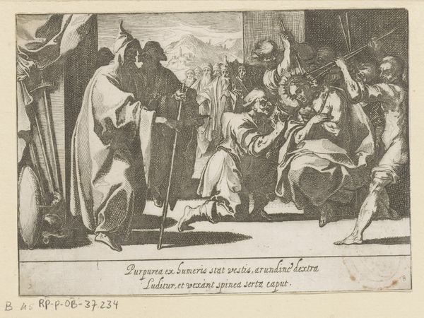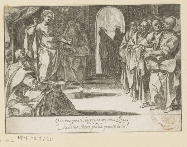 This is Raffaello Schiaminossi’s ‘Visitatie’, made around 1600 using etching. The composition of this black and white print is structured around the meeting of two groups of figures, divided by a brick wall that vertically punctuates the scene. On the left, we see male figures, and on the right, two women embracing. The linear quality of the etching emphasizes outlines and textures. Notice how Schiaminossi uses hatching and cross-hatching to create tonal variations that model the figures and their drapery. This technique gives volume to the bodies and depth to the folds of the clothes, creating a contrast with the flatter, less detailed background figures. The embrace of the women creates a focal point, underscored by the halos above their heads. The artist's choices in composition guide our eye and structure our reading of the scene, inviting us to reflect on the relationships and spatial dynamics within. Art is a complex language, a structure for meaning, and never a settled truth.
