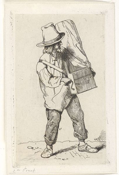Curator: Oh, isn’t this jaunty? Our spotlight falls upon an etching, "Copy of Le Gentilhomme qui Salue Tenant son Feutre sous le Bras"– try saying that three times fast!– part of "La Noblesse" and rendered between 1625 and 1700 by an anonymous artist. Editor: Dapper, absolutely dapper. Though he looks like he might be perpetually teetering on the brink of toppling over. The detail in that fur cloak—it's decadent! But what's with the shoes? Curator: Callot, most likely, after Callot – though the hand that guided the etching tool is lost to history. And yes, the attire screams Baroque excess. It's a study in the performance of nobility, right down to the rather impractical footwear. Editor: Impractical indeed! He looks less like a noble and more like a theatre performer in a rather precarious position. Are those… roses on his shoes? It’s flamboyant in a way that feels performative, maybe even satirizing the elite. Curator: That's the charm, isn't it? Prints like this were widely circulated, shaping perceptions of class and status. The artist offers a glimpse into the fashionable elite and maybe gently pokes fun. Consider the swagger in that slight bow, the careful placement of his hand—everything is meticulously posed. Editor: And set against this delicate landscape too, making the subject look ever so present and self-conscious in front of everyone. He doesn't melt into nature but performs, which highlights his role in society and adds to the comical vibe. It is staged in a way. Curator: Precisely. It reminds us that images, even centuries old, carry potent social narratives. The attire, the pose, the background—they're all elements within a carefully constructed drama about power, status, and maybe, just maybe, a hint of ridicule. Editor: A rather stylish ribbing, I'd say. And isn’t it amazing how this single image captures the theatricality of an entire era? That furtive humor makes us smile hundreds of years later, looking into those lost eyes. What can you even say. Curator: Exactly, it's almost as if he would suddenly come alive with every tickle of a feather and spring. He still breathes within us, if that makes any sense.