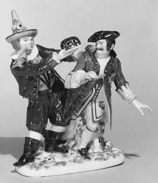 Editor: This is "The Hairdresser," crafted in 1773 by the Frankenthal Porcelain Manufactory. It’s porcelain, and it’s currently at the Metropolitan Museum of Art. There’s a real theatrical quality to it. What captures your eye when you look at this elaborate little scene? Curator: Isn’t it a marvelous glimpse into the rituals of the 18th century? It feels almost like a stage set, doesn’t it? I imagine the artist saw this tableau play out in real life: the flurry of powdered wigs, the little dog begging for attention. It's all very Rococo, frivolous, and meticulously detailed. Do you get a sense of the artistry required to bring porcelain to life like this? Editor: Absolutely. The detail is amazing. It almost looks like a painting brought to three-dimensional life! What would someone have used this for back in the day? Curator: Ah, a very good question! Something like this would've been a prized possession, a real showpiece, sitting pretty on a mantelpiece in some grand home, reflecting the owner’s taste and wealth. They really encapsulate a time, don’t they? A delicious visual whisper from centuries ago. Editor: Definitely! Seeing the everyday made into art makes you realize just how much history hides in the little things. I never thought I could be so fascinated by something as simple as someone getting their hair done. Curator: That’s the beauty of art, isn't it? It can turn the mundane into magic, revealing hidden stories and forgotten worlds within seemingly simple things. I see you learning how to "read" sculptures!