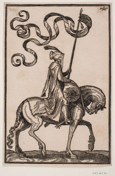Curator: What strikes you first about this print, I wonder? Editor: It has a very strong sense of formality, almost theatrical. The controlled lines and the meticulous detail give it a stiff, stately feel. Curator: That formality is interesting, especially considering the subject. We are looking at a woodcut from 1576 by Melchior Lorck titled “Bereden standartbærer, profil mod v.; standarten er 3-fliget og under den er ophængt en fjer; hans sværd anbragt mellem hans v. ben og hestens flanke,” which translates roughly to "Mounted Standard Bearer, profile to the left; the standard is three-part and a feather is hung under it; his sword placed between his left leg and the horse's flank." Editor: That title is… remarkably specific. Is the focus really on the subject or the symbolic representation of power through the standard? I wonder, considering it's the Northern Renaissance, what political narratives or commentary is present? The figure, identified as a standard-bearer, could represent any number of imperial armies, so I am interested in exploring whose "truth" Lorck represents in this portrait. Curator: Your interpretation touches on important layers. The very act of depicting a "foreign" figure, a person probably of Ottoman descent judging from his turban, and depicting him as a military man reveals much about Europe’s relationship with the "East" during this era. And how he presents that person matters enormously, the work shows a strong Ottoman warrior ready to fight. Editor: It absolutely shapes the European perspective and that makes me uncomfortable, especially as an activist, looking at this image, it begs to raise the issue of historical misrepresentation and the creation of stereotypes. Art in the Northern Renaissance was often propaganda for their particular worldview. Curator: Exactly. It underscores the politics of image-making and how it played a part in shaping perceptions of "the other". It’s a portrait of power but power always rests within particular contexts and agendas. The figure is elegant, but the art object, for consumption by whom and for what reasons, really does matter. Editor: It gives a great insight into the historical forces at play and into who decided who gets to tell what stories about who. A fascinating and sobering point, thank you. Curator: It highlights art’s engagement within a context where we get to investigate those complicated narratives.