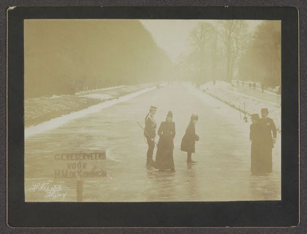 Curator: What strikes you most when you first look at this image? Editor: Immediately, I’m drawn to the texture. It feels almost palpable – the slickness of the wet street, the rougher clothes of the pedestrians, all captured in this grainy, almost blurry fashion. Curator: That texture is wonderfully conveyed, and I would say this photograph is called "A Snapshot; Paris [street scene]" by Alfred Stieglitz, created sometime between 1911 and 1913. It really encapsulates the gritty reality of urban life during that era. Editor: Gritty is the right word! You can almost feel the dampness seeping into your clothes. It's interesting how he captured the figures, too. Their clothing speaks of a certain class divide, doesn't it? And, of course, that processing that emphasizes that soft but rich materiality that brings us into the subject. Curator: Absolutely. Stieglitz, through his lens, documented the social strata of Paris. Notice how the individuals on the bridge are dressed more elaborately than the figures below. It is more than just about what they are wearing. It is about the labor of crafting, sourcing the materials, how the image represents and elevates their wearers. Editor: And he does it without being overtly political. It's more of a social observation through materiality and access. The contrast between the heavy clothing and light coloured film highlights the practicality against that backdrop. It also points to Stieglitz's choices in showcasing this particular urban scene, which speaks to the accessibility and even the challenges of documenting such diversity in urban life. Curator: I concur entirely. His focus was not merely on aesthetics, but on capturing the essence of society through its daily interactions. Stieglitz saw the camera as a tool to reveal hidden social dynamics, to reflect the tensions inherent in modern urban life. It gives insight to social and power structures. Editor: Well, I walked into this thinking only about the visual experience and its gritty feel, and I now think that this challenges the artifice with the material. It really provides much to discuss, doesn't it? Curator: It truly does, yes. It highlights not just the reality of a moment, but the societal narratives embedded within.