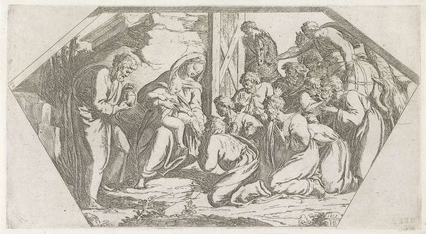 "Adoration of the Kings" is a 17th-century etching by Giovanni Lanfranco. It illustrates the biblical scene of the three kings, or magi, paying homage to the infant Jesus. During Lanfranco's time, artists often navigated religious and political expectations. Here, the representation of wealth and power, through the kings' gifts, meets the humbleness of the Virgin and Child. Consider how this image upholds traditional religious narratives, yet invites us to reflect on the intersections of power, divinity, and humanity. The expressions on the faces of the magi, from reverence to curiosity, draw us into this pivotal, intimate moment. This etching serves as a lens through which we can examine the complex relationships between religious devotion, earthly authority, and the intimate, human experience of faith.