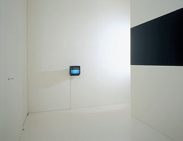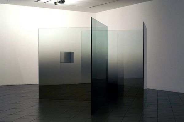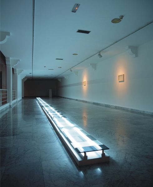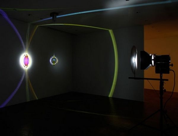 Curator: Well, this certainly demands a moment. There’s something both clinical and oddly comforting about the light in this room. Editor: Indeed. What you’re observing is "Light Progressions," a site-specific installation from 1993 by the Italian artist Nanda Vigo. Notice how she orchestrates a dialogue between geometric shapes and fields of radiant color, creating an immersive environment. Curator: Immersive is the word. The light appears to be almost manufactured, flat even; each form projects like an emissive screen hovering within the architecture. Are those actually paintings, or is the wall itself somehow… modified? Editor: The answer lies in how Vigo treats light as a palpable substance. By contrasting a harsh rectangular frame with the fluid emanation of light, she constructs a binary tension within each plane. You’re not just observing; you're participating in a carefully structured phenomenological experience. Curator: Phenomenology then. The light in this context becomes something that feels regulatory, a signal. Was Vigo involved with stage design or architecture? Editor: Significantly, yes. Her collaboration with architects and designers in the 1960s, her forays into furniture, TV sets—this interest permeates "Light Progressions." Think of the almost corporate, clinical manipulation of interior space to stimulate a kind of placid consumerism, of progress as pure display. Curator: A reading with surprising social awareness perhaps; still, I’m captivated by her orchestration of color. The contrast creates depth without reliance on traditional perspective—it really disrupts our customary reading of space. Editor: Quite so. It encourages the kind of careful consideration of surfaces as signs and challenges our presumptions about vision and constructed spaces, and how we behave in them. Curator: Thinking about all of this really does shift our awareness and demands new attention. Editor: Yes. I appreciate how even seemingly simple structures, viewed closely, reveal unexpected critical textures, which force us to reconsider their surrounding context.