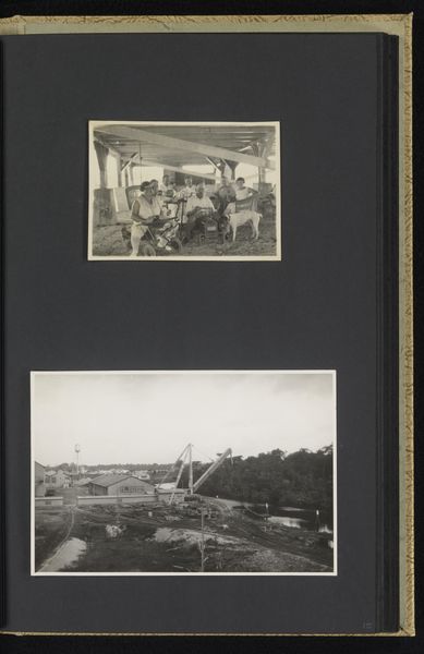 Editor: This is a fascinating page from a photo album, labeled "Moengo 1929-'30." It's a gelatin silver print with two images: one a group portrait, the other featuring a car with two figures. I'm struck by how posed and formal the group seems, especially contrasted with the informal snapshot below. What kind of stories do you think these images are trying to tell us? Curator: These are indeed potent images. Notice how the group portrait utilizes the landscape; the building looms behind, visually connecting the figures to a larger narrative of labor, perhaps industry. This physical structure is mirrored in the image below with a very modern mode of transport in front of another building of sorts. Consider what the repetition and similarities say about who and what mattered? Editor: You’re right, the industrial backdrop is significant. I was focusing on the individuals, but the context seems key. There is a lot of white clothing, are these holiday photos? Curator: Clothing here speaks volumes. White can suggest cleanliness, progress, but also perhaps a forced sense of unity in a diverse setting. Who gets to define progress and on whose terms? Do these garments suggest conformity and an attempted erasing of existing symbols and differences, or a protective coating that could shield its wearers in this new territory? It encourages me to look deeper into the role clothing and presentation have in colonial projects, which is interesting. Editor: That's a perspective I hadn't considered, that it attempts erasure of culture, rather than creating a new one. The second photo of the automobile complicates it even further because cars were becoming such a symbol of modern identity, the white clothes seem so obviously work-appropriate as they are almost shining. Thank you. Curator: Absolutely! These images, seemingly simple, act as powerful windows into a time of cultural shift, constantly negotiating old identities with the looming promise of the future. Always examine the details to unlock those deeper layers.