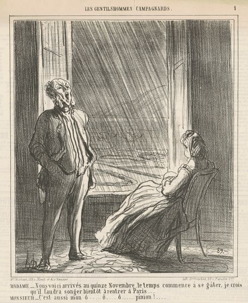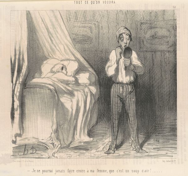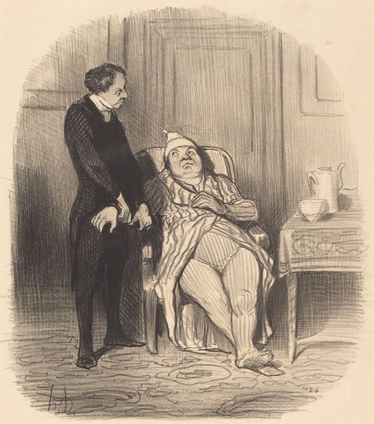 Here, Daumier captures a domestic dispute with biting wit. The husband, caught between dressing and undressing, clutches his trousers, while his wife, reclining in a chair, pointedly ignores him with her book. Note the husband's stance, a modern-day echo of the classical contrapposto, yet twisted with a sense of awkwardness and frustration. This posture, once symbolizing balance and harmony in classical sculpture, now embodies the tension of marital discord. His oversized nose is a symbolic marker – a visual echo of Pulcinella's mask in Commedia dell'arte, embodying a caricature of foolishness and bluster. It's fascinating how Daumier, through such symbols, connects the personal drama to a broader cultural memory. We see not just a husband annoyed by his wife's intellectual pursuits, but a modern re-staging of age-old conflicts, played out with the same emotional intensity, reflecting the cyclical nature of human experience and the ways in which we continually revisit and reinterpret our collective past.
