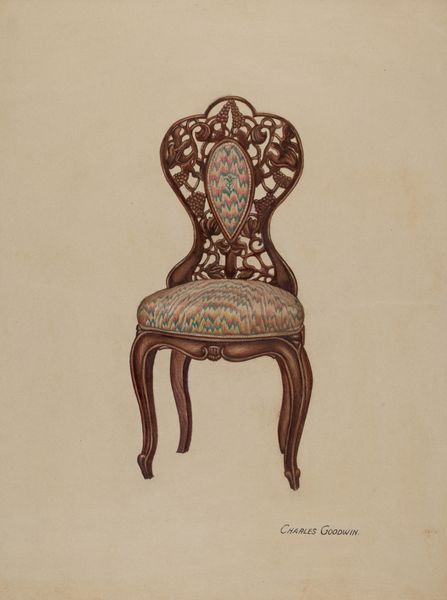 Editor: We're looking at "Armchair," a drawing from around 1937 by Elisabeth Fulda. It seems like a fairly straightforward depiction of an ornate chair, perhaps for a furniture catalog, but I can’t help feeling there’s a certain… longing in its precise lines. What catches your eye? Curator: It’s the stillness, isn't it? Like a stage set after the actors have left. I feel like the empty seat is charged with unspoken stories. Elisabeth Fulda meticulously rendered the plush fabric and carved wood, imbuing the object with its own presence. I'd wager that during the rise of the Bauhaus movement, where the functionality of an object was as valuable as its artistry, Elisabeth Fulda wanted to portray the value of an object. Why do you suppose she selected that specific point of view? Editor: Well, directly facing us like that, the chair seems almost like a portrait. I feel invited to sit, but also kept at a distance by its formal symmetry. Did people find comfort in such opulence during the lead-up to the Second World War, I wonder? Curator: An excellent observation! And one might also question the chair's symbolism. Is this about personal wealth, security, comfort? Fulda’s rendering teases us, presenting beauty in an otherwise ugly world. What feelings does that inspire in you? Editor: Now that you mention the rise of fascism, the formality does feel… slightly menacing. A bit like sitting for a photograph, as a family, knowing a storm is coming. Thanks for your insight; I initially thought I was looking at a very pretty chair! Curator: And now? The best art makes us see familiar things with fresh eyes. Art invites us to ask better questions!