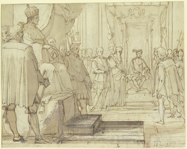 Curator: Peter Cornelius' "Scene in the Cathedral," rendered in ink on paper in 1811, depicts a congregation in quiet contemplation. Editor: The drawing is washed in pale hues, lending it a spectral, almost dreamlike quality. The figures appear caught in a moment of suspended animation. Curator: Cornelius was a key figure in the Nazarene movement. They sought to revive the spiritual depth of early Renaissance art within a religious context, often responding to the secular shifts happening within art institutions of the time. This work reflects their commitment to infusing art with morality and historical integrity. Editor: Looking at the composition, there is a very intentional organization of space and the characters occupying it. Notice the strategic use of architectural pillars to separate two groups on the right and the left, while also allowing their integration through the use of gothic arches and spatial harmony. The scene has both balance and visual interest, encouraging a very formal, close viewing experience. Curator: Indeed. These artists deliberately aimed for an art that served a public and pedagogical function, moving away from Baroque dynamism towards clarity. Cornelius sought to emulate the precision and clarity of early masters like Raphael and Dürer. Consider the impact that their artwork would have on social engagement as opposed to artworks whose subjects might not elicit the same communal feelings. Editor: One can certainly detect the meticulous detail—every figure is carefully delineated— yet there is a flatness. This deliberate flattening pushes the scene away from naturalism toward an emphasis on idealized form and symbolic clarity, and ultimately toward Cornelius' engagement with beauty as he understood it. Curator: The rediscovery of medieval art played a crucial role in shaping their artistic vision and ideology, responding against the grand narratives produced by art academies and seeking to create an alternative cultural space for spiritually guided art. Editor: For me, the composition holds an enduring beauty that encourages careful reflection on the details while being immersed in an idealized space. Curator: This drawing serves as a window into the artistic and socio-political aspirations of the Nazarene movement, revealing their engagement with history and morality.