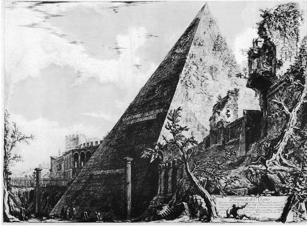 This is one of Giovanni Battista Piranesi's Vedute di Roma, or Views of Rome, rendered in etching. It presents a tableau of classical ruins, dominated by stark contrasts of light and shadow. The architecture looms large, its decaying surfaces meticulously detailed with dense, cross-hatched lines. Piranesi masterfully uses scale to evoke the grandeur of the Roman Empire, while simultaneously underscoring its fall. The minute figures scattered amidst the ruins emphasize the vastness and desolation of the scene. The composition is carefully structured to lead the eye through layers of architectural fragments, each plane rendered with precise detail. This technique not only creates a sense of depth but also invites reflection on the cyclical nature of history and the transience of human achievement. The play of light across the textured surfaces adds an emotional intensity, evoking both awe and melancholic contemplation.