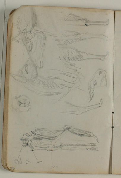 Curator: Niels Larsen Stevns created this piece, "Skitse af ko. Adresse," a pencil drawing on paper, sometime between 1900 and 1905. Editor: It looks like a study—delicate and fleeting, captured within the pages of what appears to be a sketchbook. I get a strong sense of place; the Danish countryside, perhaps? Curator: Precisely. Stevns was deeply invested in portraying the rural landscape. One could examine this within the framework of Realism, situating it against the backdrop of shifting agricultural practices and the social realities of rural life during this period. Editor: You know, when looking at the cow itself, I am struck by how simplified it is. Barely there, you might say. The animal doesn’t carry any hint of Romanticism, but nor is there any trace of critical, social awareness; it is what it is. But is this, perhaps, the intention? Does the drawing allow the subject to be, instead of standing as an anthropomorphic device? Curator: That’s interesting, considering the period. The rural often served as a battleground for conflicting ideologies and social movements. Consider the role gender plays. Who typically tended to these animals? How did such labor shape the lived experience? I am curious whether Stevns’ artistic practice consciously attempted to address or avoid these aspects. Editor: I agree. He was likely very aware of his positioning as an artist, but I still wonder if we risk placing more meaning onto it than exists? Couldn’t it simply be about the act of seeing? A genuine attempt to capture a fleeting moment of beauty and maybe even a bit of poetry on paper? Curator: Well, the question then becomes, how do we disentangle that so-called “act of seeing” from its socio-political dimensions? Can we separate individual perception from the dominant modes of representation prevalent during this historical period? Even claiming the lack of symbolism in art may hold symbolic meaning, by either going against or agreeing with artistic social norms of its time. Editor: It certainly offers food for thought on the role of realism and naturalism as political statements, doesn’t it? Curator: Yes, the social construction of landscape and rurality makes "Skitse af ko" a wonderful object of contemplation.