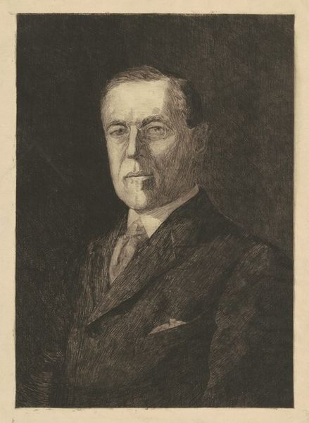 Curator: Gerald Leslie Brockhurst created this captivating image of “Henry Bell, Esquire” in 1930. What are your initial impressions? Editor: The density! The rich dark areas surrounding this Edwardian gent make him emerge from the gloom like a memory. An engraving, isn't it? Remarkable control of the burin. The tiny tool, the labour... to get this kind of detail in the suit. All that meticulous cross-hatching and the light bouncing off Bell’s face is like magic. Curator: Absolutely. Brockhurst's technique is astonishing, wouldn’t you agree? He really captures the texture of the suit. There’s such a clarity about the materiality of it. Editor: Indeed, and let’s think about what Bell signifies here. Fine tailoring speaks to a certain social position, of course, and a connection to the industries involved - the mills producing the cloth, the labour of the tailor crafting the garment... even that little bow tie! Curator: Yes, the bow tie—there's almost a softness to it, balancing the starkness. I think it is an intimate depiction, don't you find? Almost melancholy, maybe? Editor: Melancholy perhaps. But even portraits, while intended to memorialize an individual, reflect their time, don't they? The formal pose and the clothing place it so precisely in a particular social milieu, while the labor to create the print speaks of the work required to reproduce images... Curator: Reproduction. I see him captured in this tiny jewel box; the permanence of portraiture captured with the intimacy and immediacy of the printed mark. Editor: Yes. To pull a print requires skill. Ink, pressure, wiping the plate just so... each one an individual work that speaks to human touch, that reveals the means of its making. Curator: He’s frozen there in time, preserved through the artist's skillful rendering. Each line has imbued a feeling of quiet observation and thoughtfulness, making Bell feel both intimately knowable and somehow inaccessible. Editor: Right, and now I am imagining the engraver's studio in London and what that would be like! Brockhurst shows Bell not just as a subject, but as part of a larger system of production and display. Curator: Beautifully said, giving the material the life it deserves!