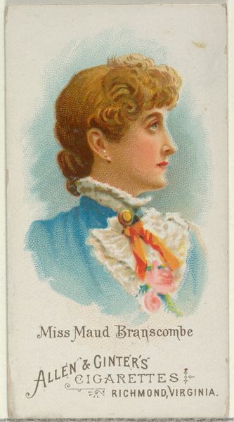 Editor: Here we have a portrait of Minnie Palmer from the World's Beauties series, made in 1888 as a cigarette card by Allen & Ginter. It's a charming little print, very decorative. What can you tell me about it? Curator: These cards, and this series in particular, offer a fascinating glimpse into the construction of celebrity and femininity in the late 19th century. Consider the title, "World's Beauties." It suggests a certain ideal that was being promoted and consumed. Who was deemed worthy of inclusion, and what does that say about the power dynamics of the time? Editor: That's a good point. She does conform to certain standards, doesn't she? Fair skin, delicate features… What about the fact that it’s an advertisement? Curator: Exactly. Allen & Ginter were selling cigarettes, and they were using images of these "beauties" to associate their product with glamour and aspiration. Think about the subtle messages: Who is the target audience? What kind of lifestyle is being sold along with the cigarettes? Are they trying to appeal to a male audience, or are they also targeting women, normalizing smoking for them too? Editor: I hadn't thought about it that way. So, it's not just a pretty picture, it’s also a carefully constructed marketing tool, reinforcing specific ideals of beauty and gender. Curator: Precisely. And let's not forget the global context. These "World's Beauties" often exoticized women from different cultures, further solidifying a Western-centric view of beauty and power. We must remember that representation is never neutral; it always carries a political charge. Editor: Wow, there’s so much more to this little card than meets the eye! Thanks, I’ve definitely learned to look at these images with a more critical perspective now. Curator: My pleasure. Seeing art this way invites us to think deeply about the relationship between aesthetics, power, and representation in shaping our world.
