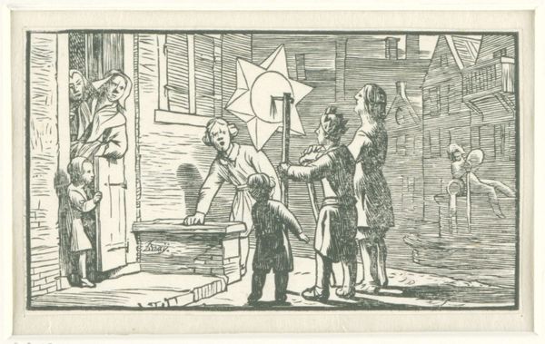 Editor: Here we have Theodorus Henricus Kerstel's "Figuren in een keuken waarin een varken wordt uitgebeend," or "Figures in a Kitchen Disemboweling a Pig," dating from 1869 to 1936, using ink and pen. It's held at the Rijksmuseum. I'm struck by the scene's domesticity mixed with...well, the very un-domestic act of butchering a pig. It’s all so matter-of-fact. What do you see in this piece? Curator: Matter-of-fact is a good way to put it. It feels like peering into another world, doesn’t it? A world where this kind of work, the labour of preparing food, was just part of daily life, not hidden away in factories and supermarkets. And there’s something inherently captivating in the juxtaposition of those almost cherubic children watching so intently. Do you find it disturbing, or merely curious? I think the curiosity makes this interesting. I almost want to join them. Editor: It is interesting, rather than disturbing, you are right, although it does take me aback. I wonder why Kerstel chose to depict it? What did he want to express? Curator: Ah, now there’s the artist’s eternal riddle! Maybe it was a longing for a simpler time, or simply an honest recording of life as he knew it. These kinds of genre scenes were popular, and they also offer the beauty to make something real, a tangible record. Art offers us a moment, to consider mortality, domesticity, tradition. Editor: It makes you think about where your food comes from. Curator: Precisely! And art’s capacity to yank us from our comfort zones, question our modern sensibilities. And isn't it charming how even dark topics can reveal glimpses of unexpected humanity? Editor: Definitely. Thanks, I will think about where the food is coming from next time I order!