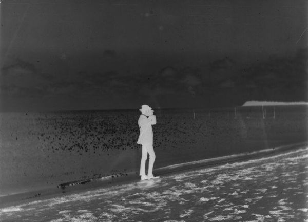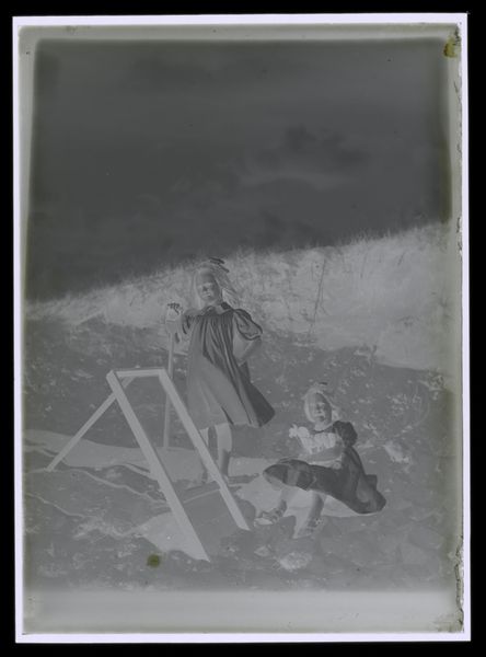 Curator: This is an intriguing untitled photograph by Lucian and Mary Brown, depicting a boy and girl with an umbrella in the wind. It's quite small, only about 12 by 10 centimeters. Editor: My initial impression is one of vulnerability, a stark contrast between the figures and the elements. The wind seems almost aggressive. Curator: Precisely. Note how the inverted tonality, the stark blacks and whites, amplifies this drama. The umbrella itself, pulled taut, creates dynamic lines across the composition. Editor: Yes, and umbrellas are often symbols of protection, but here, it seems barely adequate against the forces of nature, hinting at a deeper narrative of childhood challenges. Curator: Interesting. I see it more as a study in form, the geometric shapes of the umbrella echoing the children’s rigid stances against the implied wind. Editor: Perhaps both interpretations hold merit. It’s a powerful reminder of how visual symbols can evoke complex emotions tied to shared experiences. Curator: Indeed. A successful image can operate on multiple levels simultaneously. Editor: I'll certainly be pondering this interplay of form and symbolism as I move on.