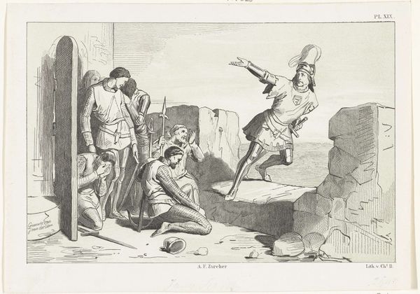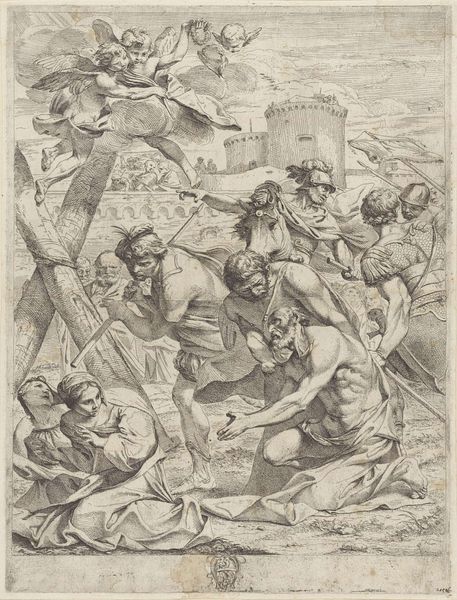 Editor: This is Cornelis Visscher's engraving, "Morra Players by a Small Limekiln," created sometime between 1638 and 1658. The scene is fascinating; there's a sense of everyday life juxtaposed with this looming industrial structure. How do you interpret this work? Curator: I see a complex interplay between labor, leisure, and the changing landscape of the Dutch Golden Age. Look closely – these men aren't simply playing a game; their engagement in "Morra" – a game of chance – unfolds against the backdrop of the limekiln, a symbol of industrial activity that was rapidly transforming the social fabric. Editor: So, you're suggesting the artist is making a comment about the intersection of work and play? Curator: Exactly! Visscher subtly critiques the social disparities emerging at the time. Notice the stark contrast between those actively working at the kiln and the men absorbed in their game. Who has the privilege of leisure? Who is forced into labor? Editor: That makes me think about class differences. The figures seem distinct; is there something in their attire that offers more clues? Curator: Indeed! Consider the clothing, gestures, the overall disposition of the figures. Do they suggest different social strata, perhaps even differing relationships to the changing economy? Moreover, how does this relate to the broader context of Dutch colonial expansion and the exploitation of resources at the time? Editor: That's a lot to consider. It almost feels like a snapshot of a society in flux, a world of labor and leisure intertwined and shaped by the circumstances. Curator: Precisely. Visscher invites us to critically examine the social, economic, and political forces that shaped everyday life in the 17th century and perhaps, to consider their resonances even today. It’s a historical artwork speaking to contemporary issues of labour, capital and society.