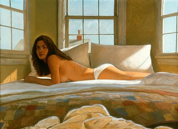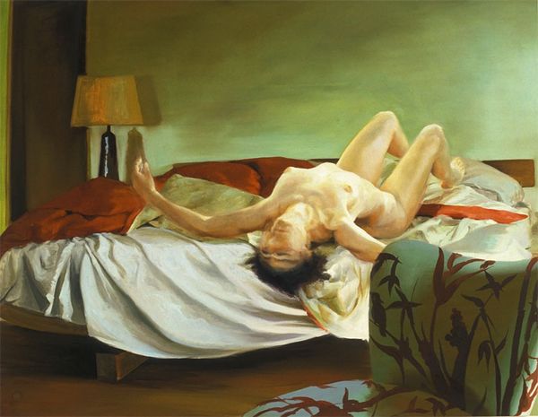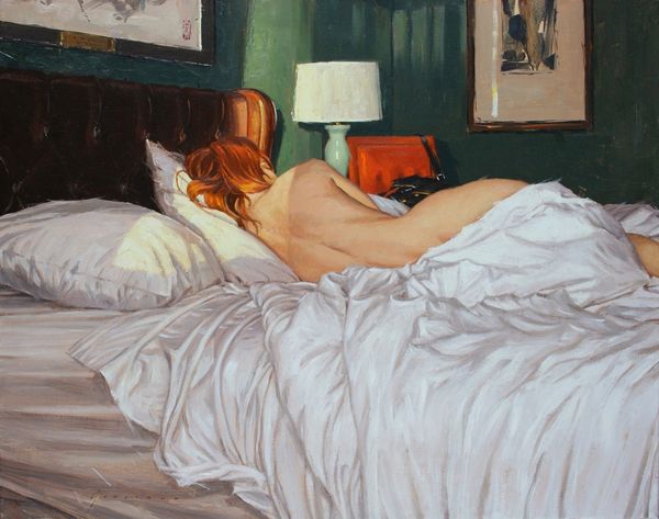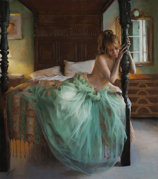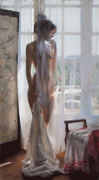 Vicente Romero painted 'The Mirror' using pastels, in what could be today. In it a nude woman reclines facing away from us, her head turned towards a mirror where we can see her face. The image is evocative, conjuring both intimacy and a sense of distance. The woman's gaze, directed at her own reflection, invites consideration of the artist's intent. What does it mean to observe someone in a private moment of self-reflection? This scene could speak to the broader historical context of representing women in art and to ideas about female identity. Historically, female subjects were often portrayed to fulfill the male gaze. While we are positioned as voyeurs, the woman seems contemplative and self-possessed. She is inviting us to think about identity and representation, and the multifaceted relationship one can have with oneself.