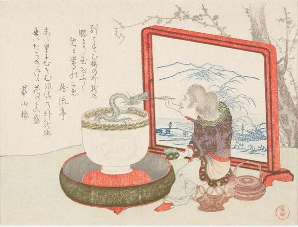 Curator: Good morning, everyone. I'm excited to discuss this artwork with you today. What strikes me is how, through precise arrangements, we see the symbolic importance that everyday objects carried in Japanese culture of this period. The work we’re looking at, dating back to the 1830s, is called "Bowl of Water with Tiny Boatman Floating," attributed to Yamada Hōgyoku. It's held here at the Minneapolis Institute of Art. Editor: My first thought? Whimsy. It feels light, delicate, and humorous, almost like a scene from a fable or children's tale. The composition centers around a large bowl—larger than life, really—rendered in watercolor and ink with incredible detail. Curator: Exactly. Note the intricate patterns adorning the bowl—a repeating motif that creates visual texture and rhythm, contrasting nicely with the smooth surface of the water. It is formally interesting as we see foreground/background, still-life/landscape dichotomies unfolding before our eyes. Editor: And the boatman! Perched atop a floating structure, the figure seems utterly self-contained in their miniature world. It speaks to human insignificance in the face of nature, or even societal structures, I feel. We see many similar tropes in the works of Japanese woodblock artists who chose to create images commenting on this perceived tension. Curator: I find your analysis to be spot-on. The lone iris flower provides a subtle yet important counterbalance to the composition, offering visual weight. Color saturation guides the eye towards different elements of this otherwise austere and minimalist scene, bringing our focus on the subject and his vessel, drawing focus toward notions of contemplation and solitude. Editor: Absolutely. Considering ukiyo-e's exploration of ephemeral beauty and pleasure, one might see this as a quiet commentary on fleeting moments. Is our boatman in search of transient happiness, simply drifting with the tides? The socio-economic constraints would certainly give his journey meaning in this sense. Curator: Perhaps. Looking at the lines and color selection more, there’s a remarkable balance between detailed precision and fluid spontaneity, which points to the artistic skill that Yamada employed here, creating a micro-narrative which exists outside any larger framework. Editor: To me, the artwork serves as a reminder of our interconnectedness. A simple scene—bowl, water, person—magnified into something profound. This drawing can challenge preconceived notions of identity, cultural relevance, and place within greater socio-historical settings. Curator: It is precisely how such careful organization generates powerful visual statements—this blend of artistic prowess is a crucial aspect of Japanese art during this period. Editor: The narrative pulls back to wider political commentaries too—art and objecthood were both essential elements of colonial and trade histories in this period. Thanks to this piece I feel able to recognize how artists in both Japan and elsewhere would push against existing societal hierarchies through symbolic artwork.