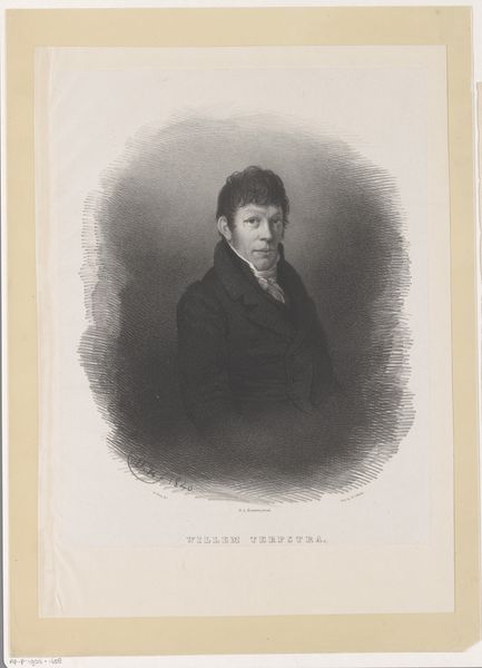 Curator: This is a portrait of Sebald Justinus Brugmans, created around 1850 by Leendert Springer. Look at the texture of the aged paper. Editor: Ah, yes! My first thought is that there's something haunting about this. It feels fragile and delicate, almost like peering into the past. A wisp of forgotten thoughts rendered with watercolour, isn't it lovely? Curator: Indeed. This watercolor illustration situates Brugmans within the academic and scientific spheres of his time, signaling his importance within the social and intellectual hierarchies of the Netherlands. How might that contextual history affect our understanding of portraits such as this? Editor: Well, knowing that, it adds another layer. Seeing the awards and badges of status tells us of position. However, if you remove the text inscription and think just for a moment – does he look like a great intellectual? The details like that splash of almost water stain and paper fading humanizes this man in an accessible form, what do you think? Curator: The damage almost challenges the established, revered view of intellectual status through which we often perceive historical figures, right? It reminds us that historical figures weren't untouchable. Editor: Absolutely. Also, notice that it’s only watercolor. I am immediately more invested. It reminds me that we're seeing an interpretation and an artist's individual reaction to this particular figure, as much as a 'record' of what he was actually like. A perfect little visual dance between truth, memory, and feeling, that’s delicious, is it not? Curator: Precisely! The image serves both as a personal interpretation and as a symbolic representation of authority within a certain time. Looking closer allows to read these visual signs within broader societal meanings linked to class, intellectual achievements, and masculinity. Editor: I love that insight. A lovely final observation as well! Thanks! Curator: My pleasure.