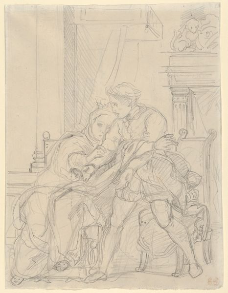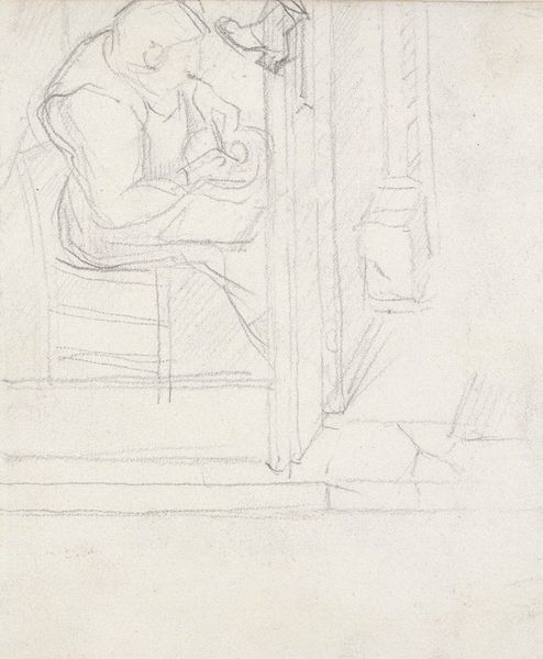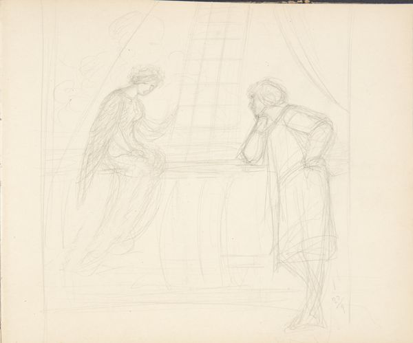 Editor: Agnes Slott-Møller's "To personer siddende ved et bord," dating somewhere between 1911 and 1935, is a seemingly simple pencil drawing. There's something so immediate about seeing the artist's process laid bare. What strikes me is the apparent casualness of it all; what can you tell me about that? Curator: What's most compelling to me is considering this work as documentation of artistic labor. The 'casualness' you describe speaks to the potential function of the work – as a means for Slott-Møller to work through ideas. It’s just pencil on paper, but consider what these readily available materials meant, materially and socially, for a woman artist in the early 20th century. Editor: So you see it less as a finished piece, and more about the act of making? Like, almost a record of thought? Curator: Precisely. Think about the act of drawing itself – the pressure of the pencil on the paper, the repetitive movements, the embodied experience of creation. How does the chosen medium—pencil, a relatively inexpensive and accessible material—reflect on Slott-Møller’s access to resources and perhaps her role within the broader artistic landscape? It’s far from the grand oil paintings of the male artists of her time. Editor: That makes me wonder if this kind of drawing was considered 'lesser' because of its materials or perceived ease of creation, but it holds a unique power precisely *because* of that. Curator: Exactly! By valuing these "minor" works and the labor inherent in them, we can start to dismantle hierarchies within art history. What does it tell us that this intimate work resides in the Statens Museum for Kunst today? Editor: This makes me see sketches like this with new eyes - less as preparatory and more as valuable expressions of the artist's everyday practice. Thank you. Curator: The value isn't solely in the finished product, but in the journey, the process, and the often-unseen labor that underpins artistic creation. Thank you for raising those very important issues.