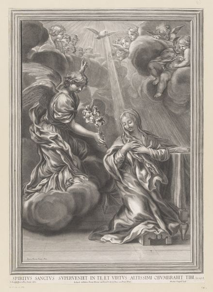 Curator: This image fairly leaps off the page with theatricality! I am struck immediately by the dramatic contrasts and sense of divine intervention. Editor: Indeed. Let's delve into what's depicted. We're looking at an engraving from 1766 entitled "Verschijning van Gerechtigheid aan koning Saul" – or "The Appearance of Justice to King Saul" – crafted by Simon Fokke. It resides here at the Rijksmuseum. Curator: Fokke’s composition is masterful. Justice, sword in hand, descends from the heavens accompanied by an angelic figure, likely meant to be understood as retribution delivered to the tormented King Saul, cowering on his throne with such striking fear and anguish in his eyes. Editor: Considering the historical context, Saul’s reign was fraught with disobedience, leading to God withdrawing his favor. The print captures that turning point, highlighting the societal implications of leadership and divine accountability within the prevalent monarchical systems of the 18th century. Curator: It's not merely about political power, but also spiritual well-being. Note how Saul shields his eyes. This action transcends mere physical aversion, becoming an outward manifestation of inner guilt and unworthiness. Editor: Absolutely. Consider, too, the choice of the baroque style – with its flourish and exuberance – as fitting the narrative to inspire an emotional reaction to moral failings on the part of rulers and to warn about the consequences of unrighteous governance. How might it have been perceived by those viewing it at the time, particularly regarding their ideas on monarchy and religious belief? Curator: The engraving acts as a potent cultural reminder, serving not just as an illustration, but also as a stern lesson encoded within religious symbols of power. The terror on Saul's face – framed within such decorative finery of throne and angelic presence – suggests a deep internal psychological disruption when facing divine reckoning. Editor: Yes, this encounter serves as a potent visual narrative concerning power, obedience, and consequences in that era. Curator: Precisely, seeing these symbols recontextualized allows us insight not just into religious history but the social memory imprinted through images. Editor: I agree. It enriches our view of this intersection, highlighting both its artistic style and lasting themes relevant throughout centuries.