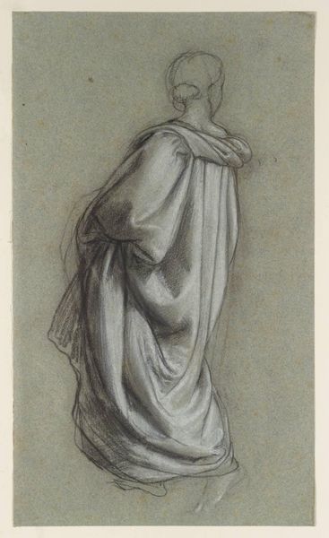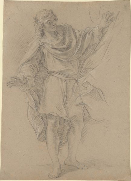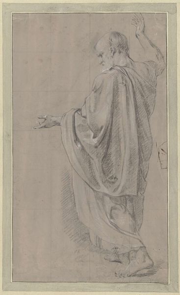 Curator: Jacob de Wit created this study of Moses around 1736-1737. It's currently held in the Städel Museum's collection. Editor: Striking. The stark contrast of charcoal against the grey paper almost feels sculptural, emphasizing the folds and weight of the figure's drapery. Curator: Indeed. Notice the dynamism de Wit achieves through the subtle variations in line thickness, skillfully evoking texture and form. The charcoal, chalk, and ink work together to create depth. Editor: I’m also struck by the material reality of this work. Looking at it, I'm thinking of the workshops where pigments were ground and paper was made, each artisan contributing to the possibility of this image. Consider the labour invested to create such work, transforming raw material into artistic form. Curator: That’s a perspective well taken. The Baroque theatricality of the pose certainly directs us, too. Note how Moses' outstretched arms and expressive gaze command our attention and activate the space. Editor: It seems less like commanding and more like supplication to me. The rawness of the medium makes it look immediate. Were I encountering the biblical figure represented this way, I would certainly feel a shared sense of supplication and respect. Curator: Certainly a plausible reading. I see it more as testament to de Wit’s mastery of capturing complex emotion through careful articulation of line and shadow. The way he uses those tools really elevates the composition to transcend mere depiction. Editor: I suppose where you see refinement, I am taken by the work's more primal elements. Regardless, considering the collaborative nature of its construction certainly enriches our viewing experience. Curator: It does, doesn’t it? De Wit’s orchestration of form is powerful, while attending to material and production allows us to better engage with art's creation and existence within history. Editor: Well put. Let us both listen and seek to see beyond our expectations.