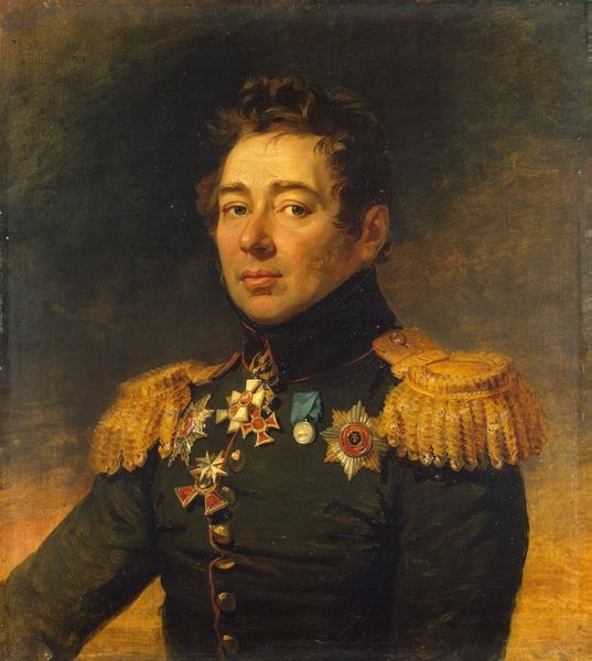 George Dawe, an English portrait artist, created this oil on canvas portrait of Ivan D. Ilovaisky. The glossy surface and seamless blending of tones give the painting a lifelike quality, typical of academic portraiture. But what I find interesting are the materials represented in the painting, especially Ilovaisky's elaborate uniform. The gold embroidery on his epaulettes and collar, the metallic sheen of his medals, all speak to the labor and skill involved in producing these status symbols. Consider the weavers, embroiderers, and metalworkers who contributed to the making of this garment, each playing a role in constructing this image of power and authority. Dawe's skilled brushwork captures the opulence of the uniform, but it also invites us to consider the social and economic systems that made such displays of wealth possible. By focusing on the materiality of the portrait, we can gain a deeper understanding of the world it represents, and the complex relationships between art, craft, and society.