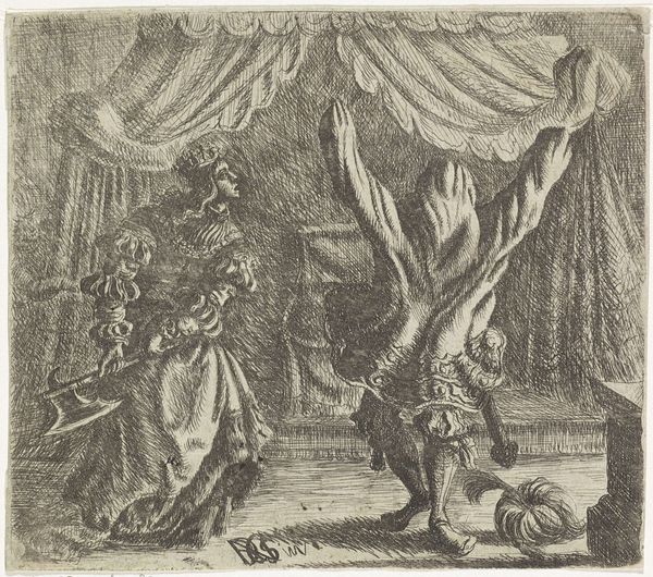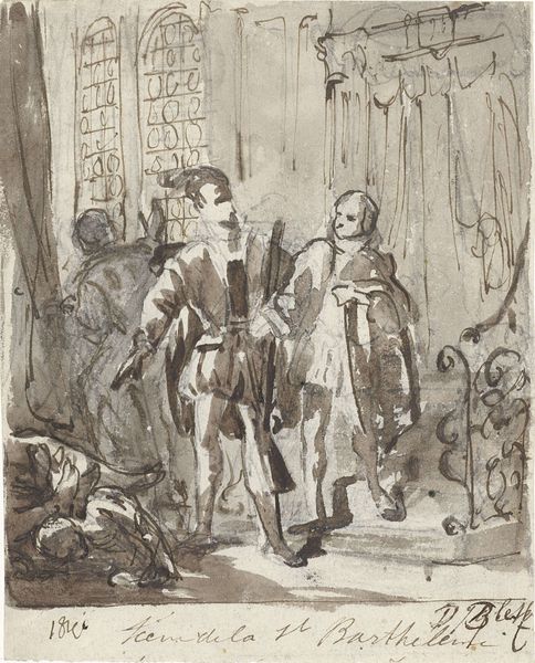 Robert Smirke created this drawing of Stephano, Trinculo, and Caliban at an unknown date using pen and brown ink, with grey wash, over graphite. The composition is dominated by the earth-toned palette, which creates a sense of enclosure and mystery, reflecting the play's themes of confinement and illusion. Smirke uses hatching and washes of brown ink to model the figures, which gives them a somewhat grotesque and theatrical appearance. The characters emerge from the shadows, emphasizing their distorted and morally ambiguous nature. Caliban is drawn with exaggerated features, consistent with his representation as a ‘savage’ man. Smirke uses costume as a tool to explore the ideas of social transgression and the disruption of natural order found in Shakespeare's play. The figures’ interactions, emphasized by Smirke's stark lines and contrasts, suggest a world turned upside down, where the boundaries between reality and illusion are constantly challenged. This drawing reminds us that the interpretation of Shakespeare’s The Tempest is always evolving.