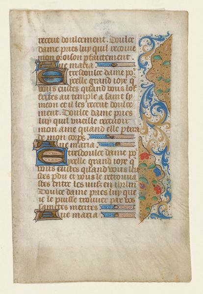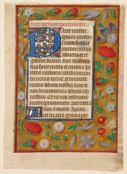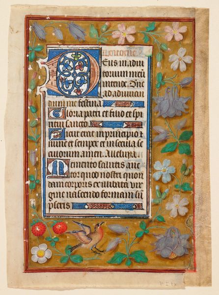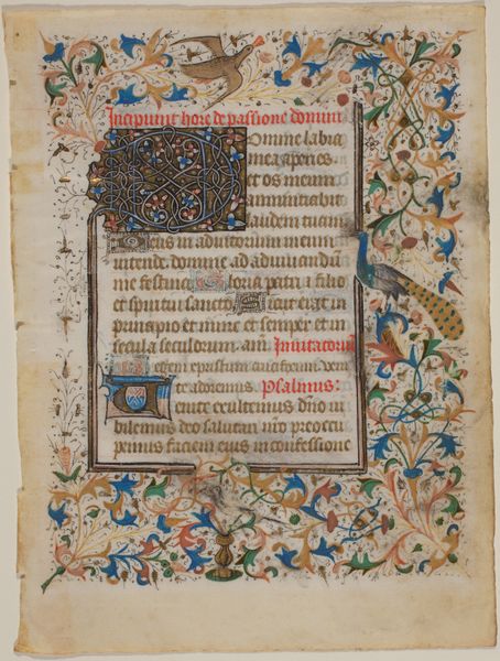 Curator: Ah, I’m always captivated by this "Leaf from a Book of Hours." It dates back to the late 15th century, crafted in watercolor. Editor: It’s mesmerizing! The density of detail reminds me of a tiny, jewel-box world. A garden filled with strange alphabets and miniature dramas. It’s less about observation, more about concentrated imagination. Curator: Exactly. Notice the framing around the text. We have acanthus leaves, flowers, strawberries, and birds… each a miniature painting in itself! They echo elements you’d see in larger panel paintings of the era. What do these mean, you might ask? Editor: Well, strawberries, for example, symbolized righteousness, also perfection in some contexts, because they’re so lovely, but short-lived! That little bird perched up there... a symbol of the soul, perhaps, on its way to heaven. So many micro-narratives swirling around the main text. I mean this art anticipates comics! Curator: (Laughs) That’s an interesting take! Yes, a series of individual narratives that speak to devotion and, possibly, worldliness at once. Those vibrant blues, reds, and greens surely enlivened personal devotion. We can consider how such illuminations invited intimate participation in religious life... A one on one with a piece like this and god. Editor: I keep coming back to the tiny narrative scene tucked in at the center: Who are these figures, with such stylized features and gestures? Is there more detail present for our eyes to behold? What could this tell us, about a story contained inside the image, inside a moment inside of a prayer. There is an idea of compression, isn't there? Curator: Certainly, miniatures condense significance; to carry a whole narrative in something small becomes portable contemplation and memory. Medieval artists worked this very idea over generations. Editor: Indeed, and for a fleeting moment here I was allowed to be privy to it. And contemplate! What else can an artist ask for? Curator: Agreed, and I get to pass on this small door opening onto history.