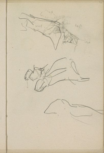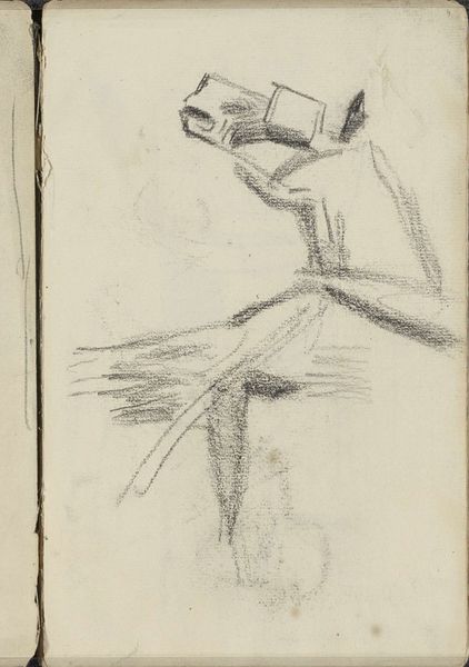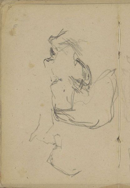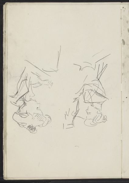 Curator: Immediately, I’m drawn to the intimacy of this quick sketch. There’s a sense of immediacy, as if we're looking over Breitner's shoulder while he captures these figures. Editor: Indeed. What we see here is “Kind en een mannenhoofd in profiel” by George Hendrik Breitner, likely executed between 1880 and 1882. It's currently housed at the Rijksmuseum. The medium appears to be pencil on paper. Curator: The rough, almost unfinished quality is striking. Look at the way the lines are laid down – very economical. The child’s form is suggested with just a few strokes, yet it conveys a sense of movement and vitality. And the adult's head… what a contrast in tone. Editor: It's tempting to see this drawing as a record of the labor of observation, really. Pencil drawings like these were crucial for developing compositions, for understanding light, volume, the relation between forms. This paper breathes utility, serving as a stepping stone within a broader studio practice. Curator: I find that materiality intriguing. Consider the formal interplay: the positioning of the figures creates a dynamic composition, a diagonal thrust that prevents the image from becoming static. The tension between the figures is palpable, almost like a study in contrasting human expressions. Editor: The kind of paper used here also matters; did Breitner make this drawing using inexpensive mass-produced material, or was this paper custom made in an artisanal studio? How would his social status influence what type of drawing equipment he'd choose and why? These are the questions which come to mind. Curator: It allows us a peek into Breitner's thought process, an intimate glimpse beyond a mere likeness of forms to the structural logic behind the visual elements presented, no? It highlights his mastery. Editor: Ultimately, this study shows how process, even more than subject, can inform the aura of art. We leave contemplating the material conditions that made it all possible. Curator: Yes, it is fascinating how those fleeting strokes can leave such a lasting visual impact.