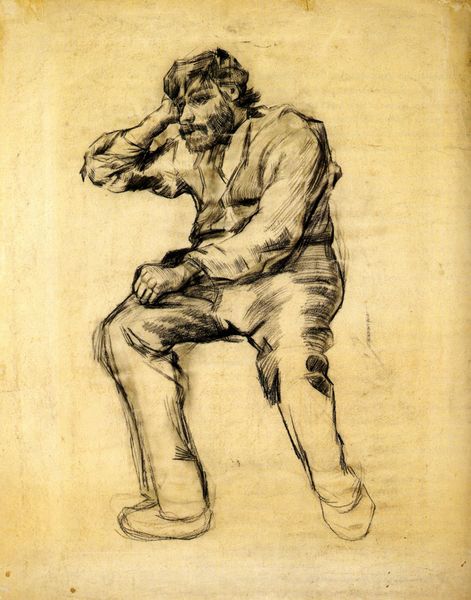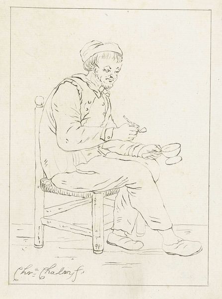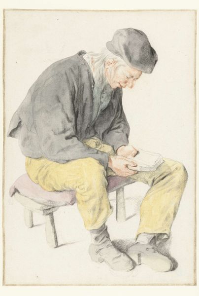 Editor: This drawing, "Seated Man Reading, Facing Left," was created between 1690 and 1700 by Cornelis Dusart. It's a pen, ink, and watercolor work on paper. The figure seems really absorbed in his reading – what do you see in this piece? Curator: Well, I see Dusart engaging in a broader tradition of Dutch genre painting. It's fascinating how artists of this period are increasingly depicting everyday life, drawing attention to the individual within a burgeoning commercial society. How does the setting—the man, his clothes, and the book in his hands—influence your view of it? Editor: It feels quite intimate, but also like a social commentary of sorts. Is Dusart celebrating literacy or perhaps satirizing something about this man’s engagement with the written word? Curator: Exactly! Think about who would commission or buy such a work. The emerging middle class wanted images that reflected their values and sometimes poked fun at the lower classes, too. This caricature serves a public role, reflecting and reinforcing social hierarchies. Are the man's worn clothes sending a message to its intended audience? Editor: They certainly contrast with the leisure suggested by reading. So it's a picture about class, created for a specific social class? Curator: Precisely. Dusart’s art enters a dialogue – a visual negotiation – about status and identity in the Dutch Golden Age. It’s a product of its social and political climate. Editor: That's really changed how I see this, it’s much more than just a man reading. Curator: Indeed, it becomes a window into the values and the often unspoken power dynamics of its time. There’s a quiet revolution happening in those little genre scenes, isn’t there?