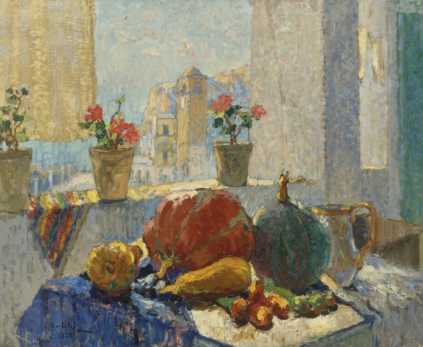 Curator: James Ensor's "Effect of Light," held at the Tate, presents a still life executed on a support measuring 508 by 616 mm. The work's emphasis is on the visible impact of illumination. Editor: It feels like a hazy memory. The light is diffuse, almost obscuring the forms, but unifying everything through a soft, luminous palette. Curator: Observe how Ensor uses the visible brushstrokes to capture and reflect light, thereby animating inanimate objects. The means of production is as important as the subjects represented. Editor: The composition is carefully constructed, with the vases, shells, and fruit arranged to lead the eye across the canvas. It's a formal exercise in balancing color and texture. Curator: And it also speaks to Ensor's engagement with the material culture of his time, positioning these objects within a specific social context of bourgeois domesticity. Editor: Perhaps, but ultimately, it's about the aesthetic experience. The subtle variations in tone create a deeply contemplative mood. Curator: It's more than just aesthetics; it's about understanding the social and economic forces that shape artistic production. Editor: I still think the artist is primarily concerned with visual harmony in the artwork. Curator: Well, I'm glad we could examine this artwork together! Editor: Indeed, a thought-provoking experience.