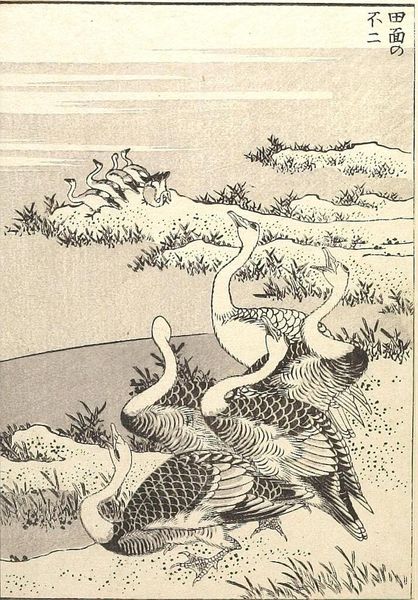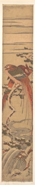 Curator: What strikes me immediately is the dramatic contrast of light and shadow within this print. Editor: Indeed. What we're looking at is a page from "Kacho Gaden", a woodblock print, attributed to Katsushika Taito II, currently residing at the Harvard Art Museums. The composition features a peacock perched among peonies. The sharp definition highlights the texture. What do you make of the subject? Curator: The means of production are front and center. Woodblock printing allowed for the mass dissemination of images. Prints like this democratized art, making it accessible to a wider audience beyond the elite. The labor involved in carving the blocks is also quite substantial. Editor: I see your point, and that labor contributes to the visual richness. The artist's handling of line and form really captures the delicate beauty of the blossoms and the regal presence of the bird. The detail in the feathers is captivating. Curator: It’s interesting to consider how this image might have functioned in society, perhaps as decoration or even a status symbol reflecting an interest in the natural world. Editor: A beautiful piece, however it was consumed. Curator: Precisely. There's a certain timelessness that continues to resonate, isn't there?