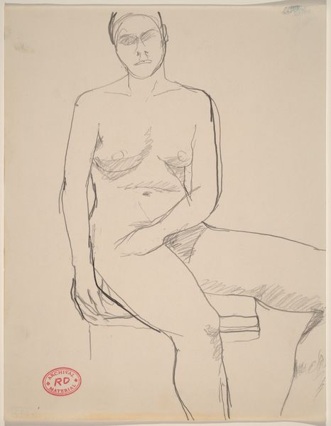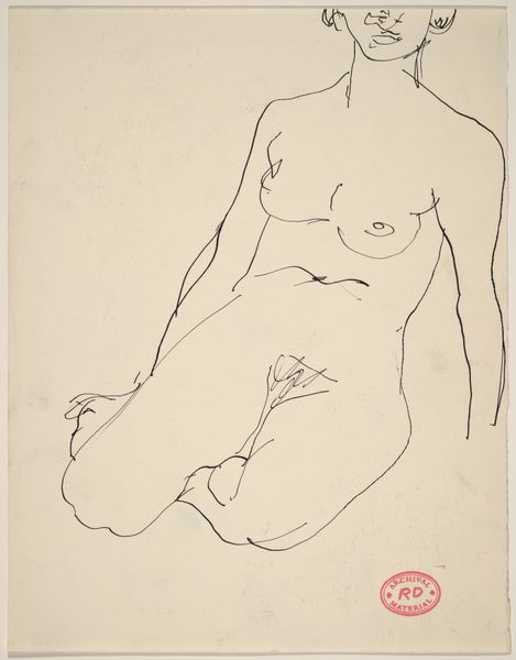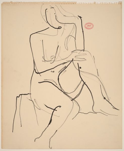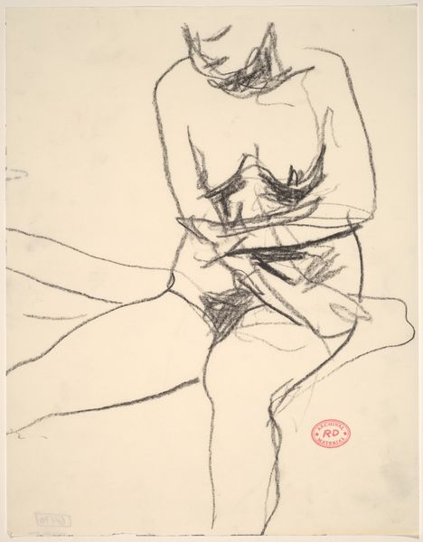 Curator: I find this Richard Diebenkorn drawing quite captivating. It's an untitled piece, a nude seated with her hands resting between her thighs, rendered in pencil sometime between 1955 and 1967. There’s something very immediate about it, don't you think? Editor: Indeed. The stark lines against the paper feel almost vulnerable. But, the faceless figure raises interesting questions. In its incompleteness, the figure transcends being just a body. This makes me think about the male gaze and the history of objectifying the female nude, which, considering it's made mid-century, could challenge some notions by erasing typical identity markers of beauty like hair or facial expression, reducing the subject to almost form, if the hand position was less vulnerable seeming. What does it bring to your mind with regard to process? Curator: I see the quickness of the artist's hand—the very essence of mark-making on paper is so evident, isn't it? Look closely and one can tell that there's been adjustments, erasures, and redrawn lines. This reminds me of other artists preoccupied with figure drawing in that era like Willem de Kooning. And how the rawness reflects a postwar context grappling with uncertainty. Editor: Absolutely. You can really trace his process and thinking. Considering the socio-political turbulence of that time—the Cold War, the Civil Rights Movement—it’s hard not to see the fragility mirrored by the figure, this kind of existential questioning. The very act of drawing a nude becomes a subtle act, maybe a commentary on visibility, erasure, or the search for the essence of humanity amidst turmoil. How the materiality here reinforces meaning beyond just rendering form. Curator: It does invite layered readings, doesn't it? A quiet reflection of process, or even protest, on the nature of drawing as labor. Perhaps an introspection into form, but very raw. Editor: Ultimately, this is how art creates meaning—by combining process, material and subject it gives new ways for considering personhood. Curator: That’s a fitting thought. The convergence is potent.
