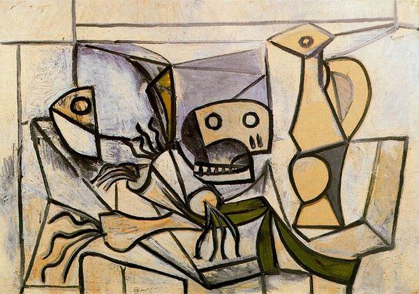This Cubist still life of a skull, urchins, and lamp was painted by Pablo Picasso, though the exact date remains unknown. It’s amazing how Picasso's limited palette of greys, blacks, and whites, punctuated by these spiky urchins, creates such a moody scene. The way he builds up forms with these faceted planes reminds me of carving. You can almost feel the push and pull of the brush, the physicality of his process. Take a look at the lamp. It's this strange, looming presence. You get a sense of weight and shadow. I love how Picasso uses these dark outlines to define the shapes, creating a sense of depth. But there’s something playful about it too. Picasso was always in conversation with other artists, and I can see traces of Cézanne’s influence here, in the way he breaks down objects into their essential forms. But ultimately, Picasso is Picasso. He takes these ideas and makes them his own. And, like all great art, this painting invites us to bring our own interpretations to the table.