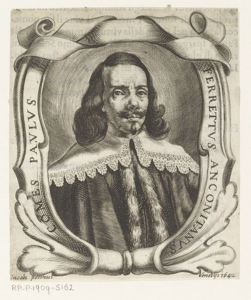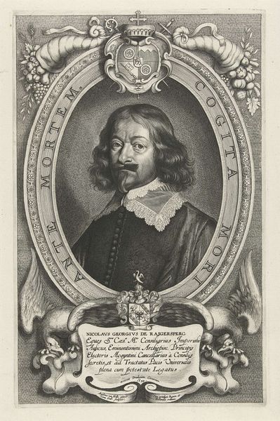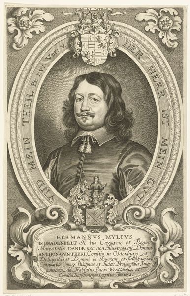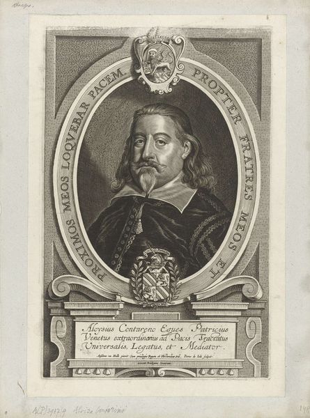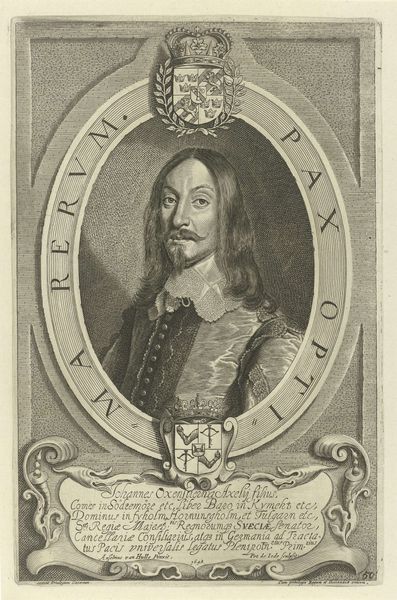 Curator: Pieter de Jode the Younger created this engraving in 1648; it’s titled *Portret van Johan Adler Salvius*. What are your initial thoughts? Editor: Striking formality! The tight lines and ornate frame create a sense of stateliness and a controlled seriousness. Almost severe, wouldn't you say? Curator: Given Salvius' role as a Swedish diplomat during the Thirty Years’ War, the severity you perceive isn’t surprising. Engravings like these often served as propaganda, shaping public perception. Editor: Note how the textures created by the engraving mimic the lush fabrics and the detailed armor he's wearing. The texture seems crucial, as it provides both detail and dynamism within a rather constrained format. Curator: Exactly. The medium itself contributes to the artwork’s message. This engraving reflects Baroque aesthetics but also echoes the political strategies of image-making in 17th century Europe, disseminating power through printed images. Editor: The lettering curving around the central oval reads "Deus sed pacis non est dissensionis." Is that right? A statement that, in essence, “God is for peace, not dissent." A concise piece of period messaging. Curator: Spot on. A fascinating and typical utilization of art in statecraft. The engraving is not just an aesthetic object, but also a piece of communicative machinery of the era. Editor: Yes, and a beautiful intersection of personal image and the political and social moment. It will be difficult for me to forget this artwork. Curator: Indeed. These portraits connect us to the strategies employed for consolidating and projecting authority across time.