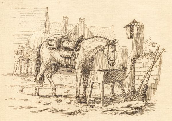 Editor: So this is Wilhelm Marstrand's "Don Quixote stiger til hest," made sometime between 1810 and 1873. It's a drawing, and it feels almost like a quick sketch. There’s a lot of emphasis on line work and detail, especially in the figures. What catches your eye when you look at this piece? Curator: What intrigues me is how Marstrand, through the simple act of drawing, brings to the fore the social dynamic embedded in Cervantes' narrative. Look at the stark contrast in the portrayal of labor. The horse, undoubtedly a significant investment, contrasts sharply with the humble donkey. Who owns these animals? Editor: Right! It emphasizes their class difference. Don Quixote in his gleaming, if somewhat ridiculous, armor versus Sancho Panza and his donkey. It’s kind of humorous, actually. Curator: Indeed, and the humor isn't just in their appearance. Consider the artist’s labor. Drawing was a means of reproduction and dissemination of stories, reliant on paper, ink, and skill. But the drawing's purpose then isn't the same now; is it purely artistic expression, or advertisement for larger paintings, engravings or plays, perhaps? Who was intended to view it? What kind of making-of access does it offer, almost like unreleased film footage of a blockbuster? Editor: That makes me see the sketchiness in a different way. The drawing material itself emphasizes accessibility, doesn’t it? As opposed to, say, oil paint. Curator: Precisely. It democratizes the epic, highlighting not just the grand adventure but also the economic and social realities underpinning the very act of storytelling and the lives within the story. The drawing, in its very being, speaks to these material conditions. Editor: I’d never really considered that aspect of the image. Thanks. Curator: Likewise, thinking about its materiality offers new layers to familiar works.