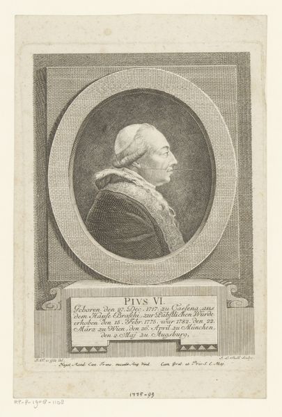 Curator: This portrait, "Christoph Glockengiesser", attributed to Martin Heinrich Omeis, offers a fascinating glimpse into the Baroque era. It's an engraving, dating sometime between 1665 and 1703. What’s your immediate impression? Editor: Stark and composed. There’s a gravitas to the subject—the dense, almost cross-hatched lines lend the piece a somber yet commanding air. It’s fascinating to consider what his name "Glockengiesser" actually means... bell-caster! I imagine sound was extremely important to the world then. Curator: Indeed. Notice how the artist uses the oval frame and cartouche not just as decorative elements, but as structural components that reinforce the portrait’s central focus. The precise linework defines form and space. Observe, particularly, the details in the subject’s robe, where the layering suggests volume and texture despite the monochromatic palette. Editor: Absolutely, but it's the visual cues and clues surrounding him that seize my imagination. The flourishes feel vital in Baroque portraiture. I notice the prominent lettering on the banner, proudly proclaiming "DOMINVS. CHRISTOPHORVS GLOCKENGIESSER," cementing his identity and status. And isn't it telling to have him framed by that ornate foliage. A powerful man displayed proudly. Curator: Semiotically, these features enhance the representation. But what truly distinguishes this piece, for me, is its subtle interplay of contrasting forms—the solid, assured depiction of Glockengiesser himself set against the relatively ornamental backdrop. It highlights a certain restraint and dignity in the figure’s portrayal. Editor: Restraint, perhaps... but one steeped in an age of opulent symbolism. Those precise details, to my mind, elevate it from a simple likeness to an icon. A permanent celebration of his societal contribution and legacy. That his name is so closely tied with his contribution must have carried extra meaning. Curator: It offers a compelling articulation of power dynamics within its historical milieu. The strategic composition brings that man—his presence and achievements—directly into our view, effectively bypassing the barrier of time. Editor: For me, this portrait embodies not just the individual, but a bell-ringer into the historical imagination. An artifact full of echoes and impressions about who and what medieval society admired. Curator: A final point: Consider that the visual tension is elegantly balanced by that crisp execution—rendering it perpetually contemporary in the discourse of portraiture. Editor: Ultimately, "Christoph Glockengiesser" stands as a profound testament to the power of visual emblems to shape and preserve cultural memory.