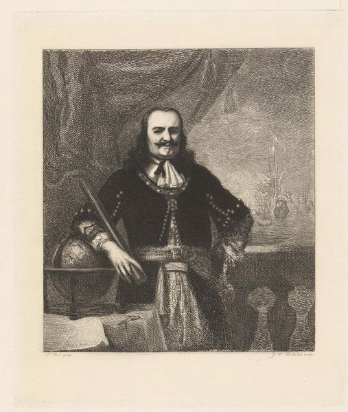 Franciscus Bernardus Waanders created this portrait of Michiel Adriaansz. de Ruyter using lithography. The composition is formally structured around the sitter who is framed by elements that speak to his status and occupation. Note the strong verticality achieved by the figure of De Ruyter, contrasted by horizontal lines of the table and text, which creates a sense of balance. The use of monochrome lithography, with its subtle tonal gradations, imbues the scene with a sense of seriousness, inviting contemplation on the sitter's legacy. The portrait uses several semiotic cues: the globe signifies exploration and dominion, while the naval scene in the background alludes to maritime power. Through this calculated arrangement and symbolism, the artist constructs a narrative of authority and achievement. Ultimately, this work is an exercise in constructing a public image through careful manipulation of form and symbol. It invites us to consider how portraits function not just as representations, but as carefully constructed statements about identity and power.