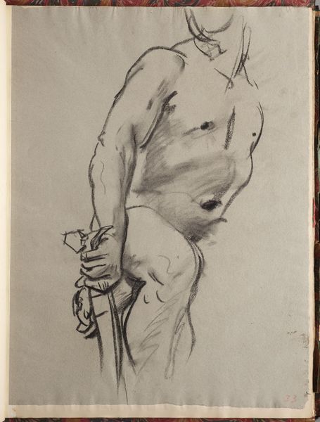 Curator: This is "Studies for Second Angel from Left, Israel and the Law, Boston Public Library" by John Singer Sargent. It’s just over 60 centimeters tall. Editor: The muscularity of the figures is striking. There's an imposing, almost defiant mood. Curator: Sargent was exploring how to represent law and justice through figuration. This piece served as preparatory studies for his murals within the Boston Public Library. Editor: Note the book's open spine. The raw materiality of this sketch offers a glimpse into the artist's process and the physical labor of creating these figures. These are studies for angels, which typically symbolize a connection between the divine and the earthly realms. Curator: Yes, this sketch shows a clear tie between the angel as a symbol of authority and the earthly concept of law. Editor: Considering Sargent's social standing, his engagement with religious and legal iconography is intriguing. Curator: Indeed. It opens a new perspective on the societal implications of art production in Sargent's time. Editor: It's fascinating how the interplay between the medium and the symbolic content provides insight into the artist's choices.