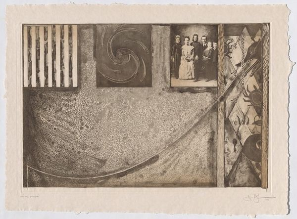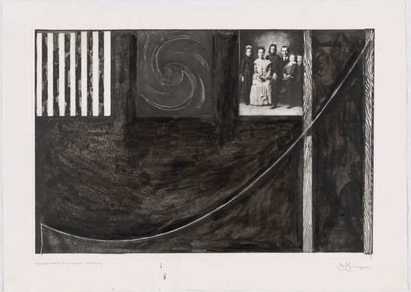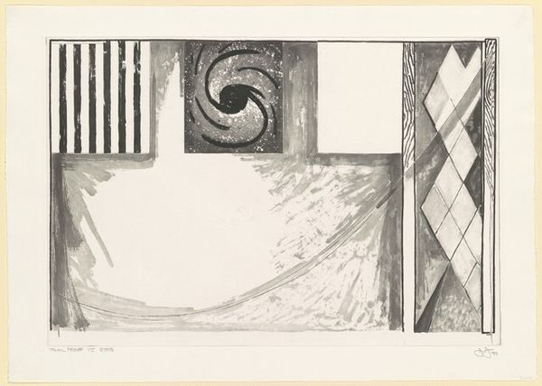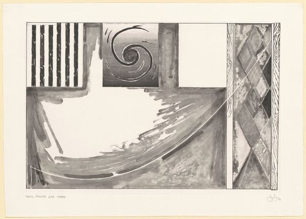 Curator: Right now we're standing in front of an intriguing print, simply titled "Untitled," created in 2001 by Jasper Johns. It’s a mixed-media piece, a beautiful example of abstract expressionism with a monochromatic palette. Editor: My first thought? It's like a series of visual puzzles all whispering to each other. Somber, yet playful – I can't help but find myself curious, almost beckoned into its world. Curator: Precisely! Johns often invites that sort of engagement. What you're experiencing aligns with his continuous interest in forms and lines that challenge our perceptions. We see squares hosting patterns—stripes, a spiral, harlequin diamonds, plus a solitary blank canvas. Editor: The composition is quite stark and, dare I say, unsettling. It’s that blank square amidst the other patterns... almost like an unwritten question hovering. Is he reflecting society's compulsion for completion, the innate human drive to solve things? Curator: I think so, the piece sits beautifully at the junction between inner turmoil and the rational exterior world. Johns' works, including this untitled piece, constantly invite reflection on meaning itself, mirroring the tumultuous period of history that formed the background for so much abstract expressionism. Editor: A testament to enduring artistic ability. It is, ultimately, the unsolved puzzles that capture us. I'm especially interested in the use of printmaking to address those deep concepts. Curator: It leaves you wondering, doesn’t it? This interplay between public and private, visible and hidden. Editor: Very true, an engaging dance of dark and light! Curator: Absolutely, food for thought as you go forth!