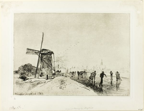 Curator: This etching by Wijnand Otto Jan Nieuwenkamp, potentially created between 1903 and 1928, is titled "Wipmolens aan de Vlist tussen Haastrecht en Schoonhoven." Editor: It's quite striking; a somber and evocative composition with a strong emphasis on texture. The detailed cross-hatching gives a palpable sense of the wind and dampness characteristic of the Dutch landscape. Curator: The landscape itself is certainly integral here. We're seeing the utilization of wind power not as an isolated incident, but within the daily life of laborers and millers navigating the watery terrain of the Dutch countryside. Nieuwenkamp presents it as part of an intricate and integrated network. Editor: Agreed. The compositional balance is key, too. Notice how the tallest windmill is offset to the left, anchoring the image, while the others diminish in scale, guiding the eye across the landscape. Curator: Absolutely. The printing process also needs considering; etching lends itself particularly well to the atmospheric depiction, as these linear elements and tonal modulations speak to how labor and artistry influence environmental adaptation and resource use within society. The medium mirrors the industriousness depicted! Editor: Interesting point. But beyond its socio-economic implications, the print is simply a compelling example of graphic art. The stark contrast, the clever use of negative space to suggest light… it possesses a timeless quality, resonating on a purely aesthetic level. The textures achieved really make the windmills into a marvel to look at. Curator: Though, what's also remarkable is Nieuwenkamp's depiction of daily life. See the figures on the bridge. These weren’t picturesque details but highlight that these industrial tools depended on real humans, forming critical intersections between material progress and societal living standards. Editor: True, but the effectiveness relies as much on the skilled application of the etching technique as it does on the narrative. If you imagine this rendered in a less nuanced medium, it loses impact despite its intent. Curator: An interesting discussion about our role within our ecological networks and technological dependencies – still resonant now. Editor: Indeed – I'm glad we paused to contemplate this picturesque print today.