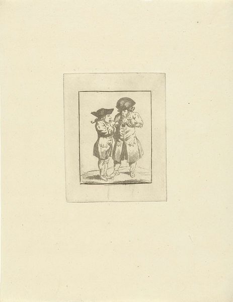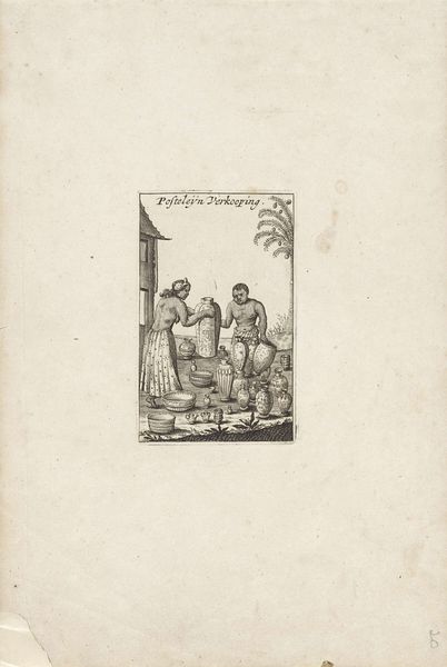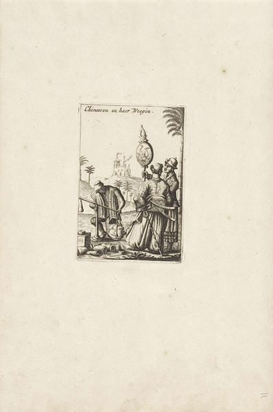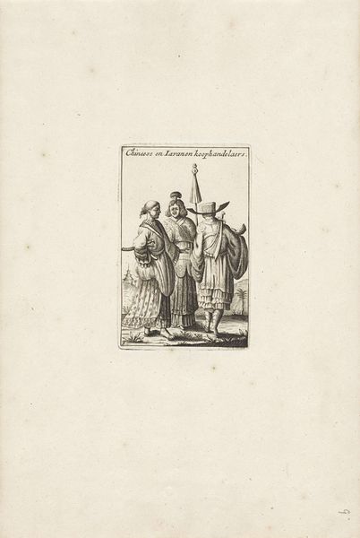 Editor: This is "Chinese man en een tot slaaf gemaakte bediende" or "Chinese man and an enslaved servant," an engraving made sometime between 1682 and 1711 by Pieter Schenk, housed in the Rijksmuseum. The contrast between the two figures is stark, highlighting what seems to be an imbalance of power. What can you tell us about this work's historical context? Curator: The print serves as a potent visual artifact reflecting early European perceptions and the construction of "otherness" in the Baroque era. How are these figures framed within a burgeoning globalized society dependent on trade routes and colonial ambitions? Editor: I see... So the composition isn’t just about portraying two individuals, but also communicating the prevailing power structures of the time? Curator: Precisely. Note the “Chinese man’s” attire, his posture of command. Consider then how these kinds of prints might have functioned to shape public understanding and justification of social hierarchies back in Europe. Did they encourage certain attitudes, for instance? Editor: Yes, that makes me think about how the “exotic” East was depicted, and how prints like this reinforced stereotypes. It’s interesting to think of art not just as an aesthetic object, but as a tool for social conditioning. Curator: It's important to ask: whose story does the artwork prioritize, and whose voices are silenced in its narrative? Furthermore, where and for whom was this image circulating? This provides us with an interesting and very troubling understanding of how historical European society understood globalization. Editor: I had not thought of it that way before. It gives a new perspective on understanding these artworks, considering their production and societal impact. Thanks! Curator: Absolutely. By unpacking the visual politics embedded in seemingly simple portraits, we can critically engage with the power dynamics of the past and present.