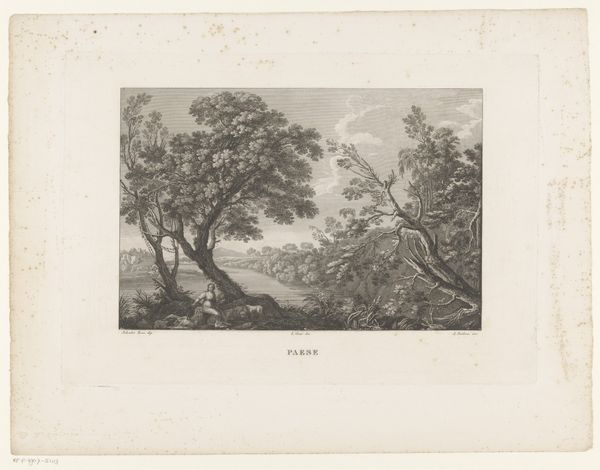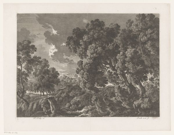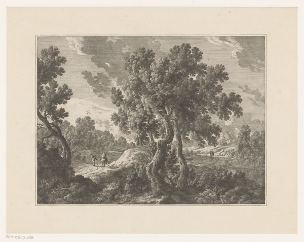 Editor: This is *Landscape with Three Trees in the Middle* by Nicolas Perelle, made sometime between 1613 and 1695. It’s an etching, so lines and textures are everything. I find it very tranquil; the figures seem to be enjoying the landscape rather than working it. What do you see in this piece? Curator: Intriguing question. Formally, the composition establishes a visual hierarchy. The trees, centrally positioned, function as a repoussoir, directing the gaze into the receding planes of the landscape. Consider the foreground figures: are they truly at rest, or do they subtly contribute to the modulation of light and shadow that articulates spatial depth? The density of the etched lines defines the tonal range, which evokes the materiality of the scene. Editor: So the positioning and darkness creates depth, almost like layers in the picture. I see your point about the figures—they're more than just details; they're compositional tools. Do you think the relative lack of detail helps draw your eye through the image? Curator: Precisely. It also speaks to the power of line. Examine how Perelle employs hatching and cross-hatching. Note that these elements aren’t merely descriptive. They define the character and texture of the leaves, the rock, the bark of the trees. Semiotically, we might consider these strokes as 'signs' that articulate 'nature' within a framework of artistic conventions. Do you see it? Editor: Definitely, and understanding those conventions can give the piece a completely different meaning to a contemporary eye. Thanks for highlighting these compositional relationships. Curator: Indeed. Visual language and its nuances allow a greater appreciation for its materiality. A pleasure.
