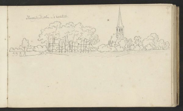 Curator: Here we have Abraham de Haen the Younger's "Dorpsgezicht te Nijeveen," which translates to "Village View of Nijeveen," possibly created between 1732 and 1737. Editor: My first impression is its simplicity. A light, almost fleeting sketch. The ink wash feels very immediate, a sort of on-site record, doesn’t it? You can almost hear the scratching of the quill on the paper. Curator: Exactly. It embodies a specific cultural memory—the Dutch Golden Age landscape tradition, finding the sublime in the everyday. The church spire, though subtly rendered, pierces the skyline. The frottage is an anchor in both landscape and cultural time. Editor: The artist's hand is quite evident. I'm curious about the choice of ink and pen on paper. What sort of availability would those materials have had at that time? Was paper becoming more common? The frottage looks more like a smearing technique in service of light rather than material exploration, but it does soften what would be rather crude, blocky dark areas by adding tonal variations, that create depth with light in a very particular way. Curator: Ink, pen, and paper were increasingly available to the burgeoning middle class, suggesting a democratizing trend in artistic creation, capturing moments in life for oneself and others. The church's prominence represents more than mere aesthetics; it signifies spiritual and social order in this village community, the psychological foundation of village life at the time. Editor: True. It grounds the image. I’m now thinking of the labour involved, of gathering materials, of transporting them… of the craft, too, especially the penwork to create depth using fine hatched and slightly wavering marks. All this makes this sketch a beautiful record of skill that transcends merely the utilitarian depiction. Curator: That balance is key. It's not merely documentation; it imbues the scene with an atmosphere that transcends time. A quiet pastoral scene becomes a symbol of societal values of the age, a visual reassurance in an age of rapid change. Editor: I agree, there’s a harmony to this that belies its simple execution. Curator: The symbolic is hidden within plain sight. The Dutch light becomes a carrier of moral weight. Editor: I'll carry that insight with me. Now I see this pastoral image as not only a visual document but also an item deeply entangled in labor and cultural implications.