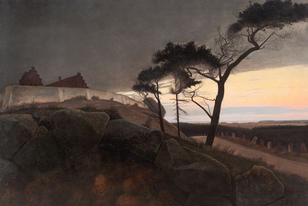 Editor: So, this is Johan Christian Dahl’s oil painting, “The ruined Church at Avaldsnes at Karmøy,” created around 1820. There’s this incredible, brooding atmosphere… the imposing clouds, the melancholic ruins. It makes you wonder about time and history, I guess. What catches your eye most about this piece? Curator: Immediately, the composition speaks volumes. The ruined church isn't just a pretty backdrop; it's a symbol. Think about the sociopolitical context of the time. The rise of nationalism often looked to romanticized versions of the past for legitimacy and identity. Do you see how the dramatic lighting and the decay work to evoke a particular feeling about the Norwegian past? Editor: Yes, the church feels deliberately placed, almost… staged? But, like, what history are we supposed to see here? Curator: Exactly! Consider how ruins like these became potent symbols in the Romantic era. Dahl is deliberately highlighting a narrative about Norway's heritage. It connects the landscape with historical memory and the power structures embedded within it. Do you think this idealized ruin aligns perfectly with reality, or could it also be pushing a nationalistic agenda? Editor: I see. The ruin isn't just *there*. It's there to communicate a specific version of the past that benefits a particular narrative, maybe one about Norwegian strength and resilience… Even if the reality of those pasts might have been totally different! I suppose paintings like this really do create our idea of ‘history’, huh? Curator: Precisely. Dahl’s painting reveals how art functions as a social tool. Reflecting upon its cultural impact enriches its appreciation. Editor: That’s an eye-opening angle, thank you for making it clearer!