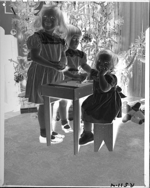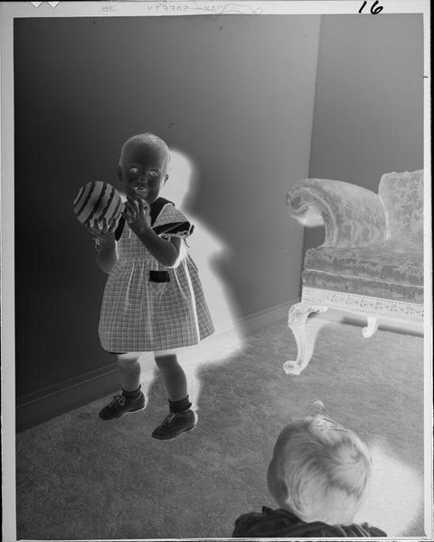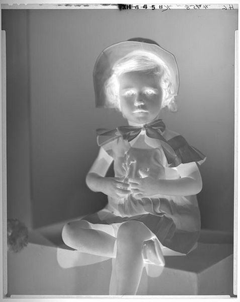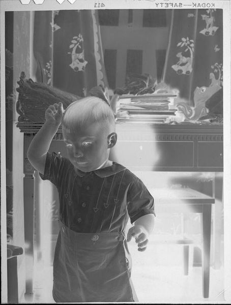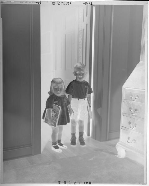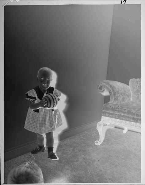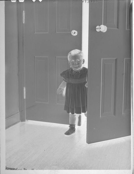Curator: This arresting silver gelatin print, attributed to Lucian and Mary Brown, shows a young boy helping a baby learn to walk. The composition immediately strikes me as evocative. Editor: Yes, that inverted contrast gives it such an ethereal, almost haunting quality. It makes the scene feel like a memory, or a dream. Curator: Precisely. Consider how this image would have functioned in the context of family photography. It serves as both a record and an idealization of familial bonds and childhood development. Editor: I see such powerful symbols here: the supporting older brother, the trusting grasp of the baby. The image taps into such universal ideas of care and guidance, even dependence. That simple doorway suggests a transition, walking into the unknown. Curator: It's fascinating how a seemingly simple snapshot reveals so much about the social values and emotional landscape of its time. Editor: And how those same values and emotions still resonate so strongly today. It's a lovely piece.