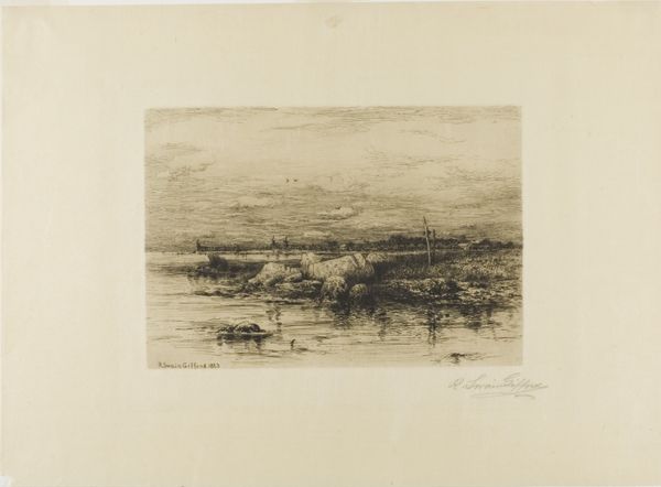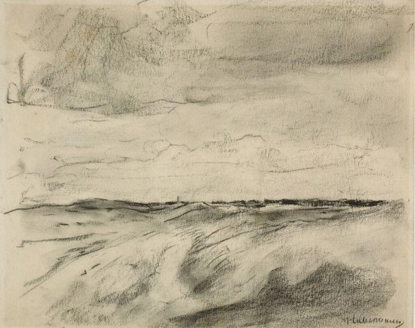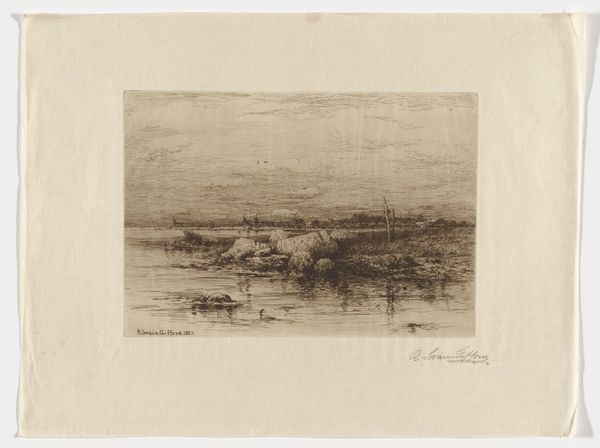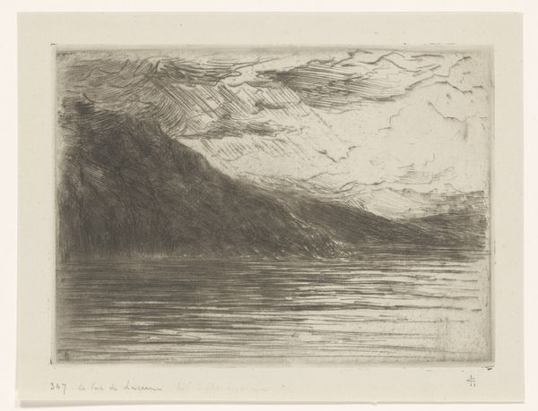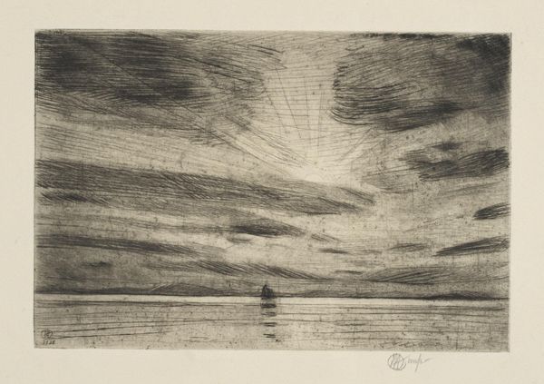 Carel Nicolaas Storm van 's-Gravesande created this etching, a 'Seascape with Clouds,' capturing a scene dominated by the sublime power of nature. Observe the dramatic clouds, heavy with rain. This depiction of the natural elements echoes the ancient symbol of the ‘storm,’ often associated with chaos but also with purification and change. Think back to the biblical flood or Zeus wielding thunderbolts – the storm is a moment of divine intervention. Consider how artists across centuries have harnessed the storm's emotional force. From the Romantic painters to contemporary photographers, this motif serves to evoke feelings of awe and vulnerability. It taps into our collective memory, stirring deep, subconscious fears and reverence for nature's might. This visual language conveys intense emotional states engaging viewers on a subconscious level. Indeed, the storm, in its cyclical return, reminds us of the continuous dialogue between humanity and the elemental forces that shape our world.